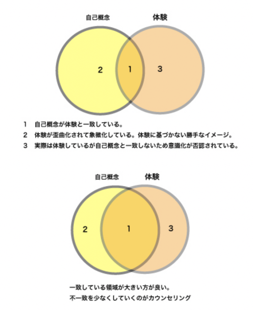 自分が実際にできること、経験という現実と、自分が自分で思っているイメージ(自己概念)が一致していること。カウンセラーは自分の内面の体験に気づき、それをありのままに受け止め、自分の意識を否定したり歪曲したりしないでいられなければなりません。逆に、クライアント(相手)は、これが一致していないために、不安と葛藤の中にいます。先ほどの『タイガー&ドラゴン』の歌詞の〈背中で睨み合う虎と竜じゃないが、俺の中で俺と俺とが闘う〉ように、不一致の状態です。