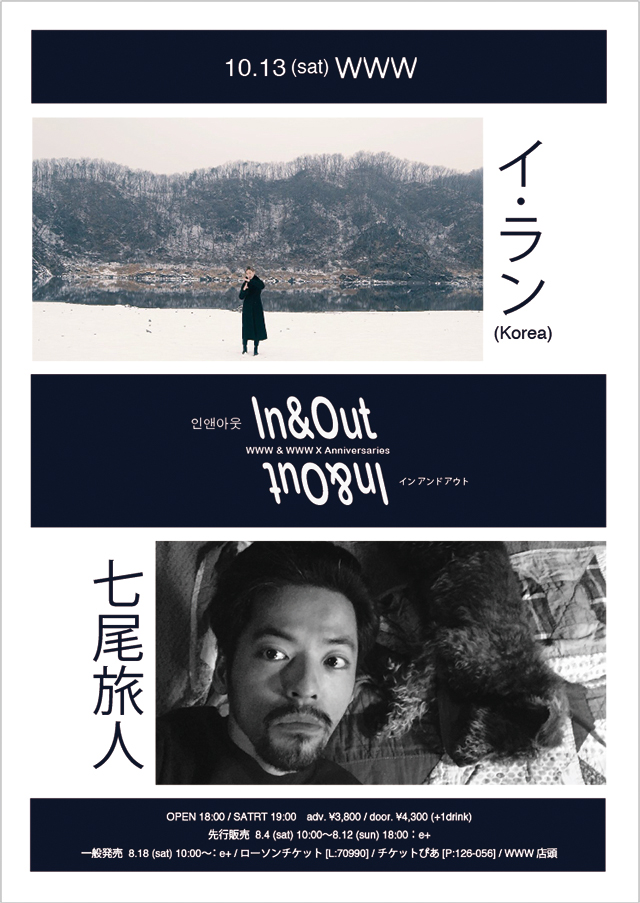 WWWによるアジアインディロックシーンの交流地点シリーズ「In&Out」。アニバーサリー記念として開催する今回は、その歌声、文章、活動姿勢やインタビューを通しての発言が大きな注目を浴びている韓国ソウルのマルチ・アーティスト “イ・ラン”と、WWWでもこれまで「百人組手」、「兵士A」など衝撃的ライブパフォーマンスで数々の名演を生み出している”七尾旅人”が邂逅!
