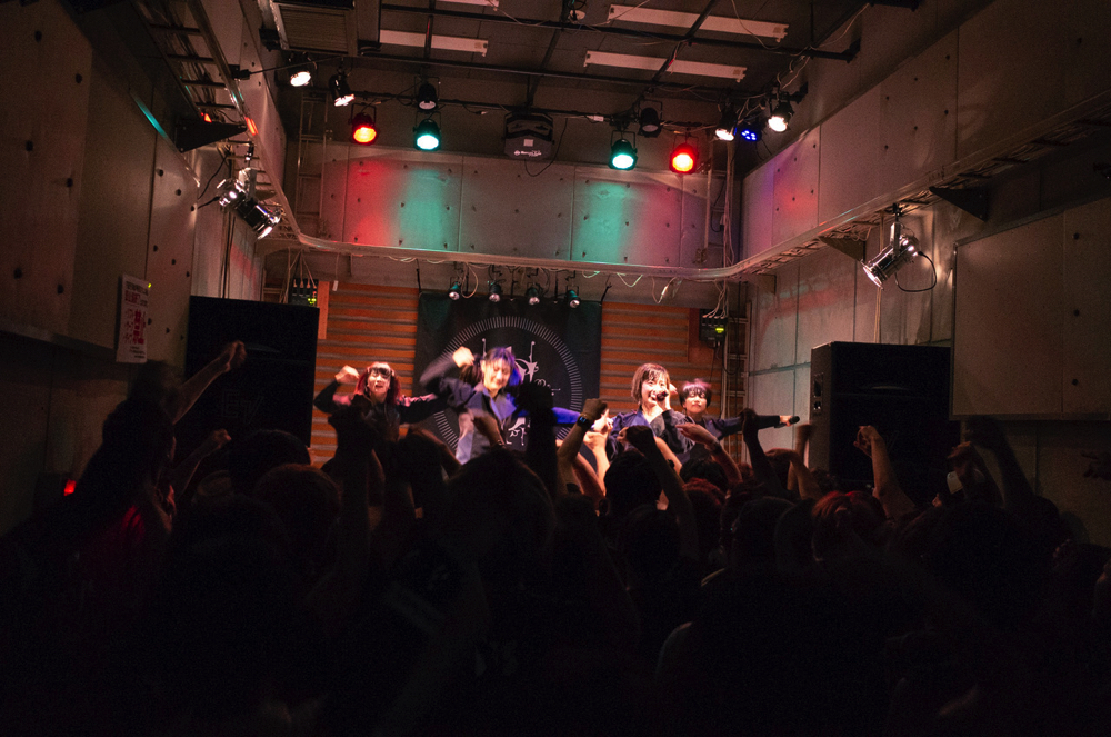 「gives」のイントロが流れる中、客席中央から歌いながら登場した4人。4曲を立て続けに歌うと自己紹介へ。ネルが「我々BiS、来月から新体制になります。私は9月からBiS2ndとして活動させていただくわけで、この4人でのライヴ、今日を含めると3回の1回1回が正念場。そう燃え尽きて、1回1回の会場を焼却炉にして帰るのが私の目標です。みんなも同じはず。燃やすぞ。3、2、1、ファイヤー!」