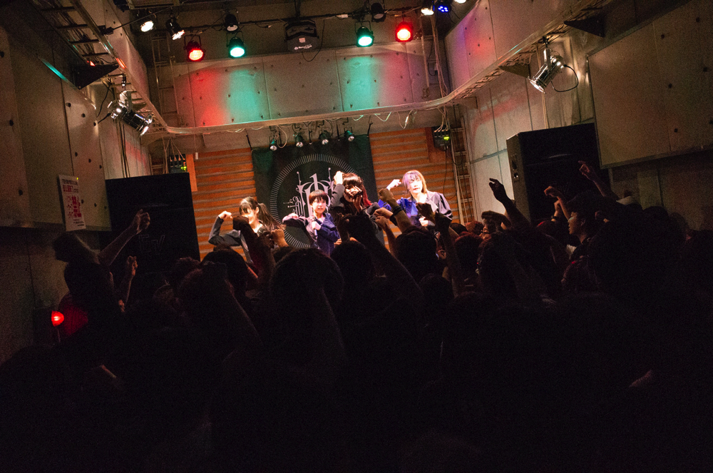 「gives」でスタートし、4曲を歌いきると、美人担当のアヤ、りんごのメイクをしたキカ、人生楽勝担当のペリ、りんごの髪型をしたミュー、「外に出たら空気が北海道と一緒でしんみりした」と語ったムロパナコ、青森で育ったYUiNAが、それぞれ自己紹介をした。