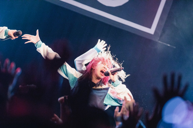 ステージに4人が登場すると「Don’t miss it!!」でライヴはスタート。3曲目の「パプリカ」では、ゴ・ジーラがハナを先導するなど4人全員が全力でスクワットをし、曲が終わると4人ともステージに倒れ込む場面も。1stキャプテンのゴ・ジーラがメンバーを支え、起き上がらせるなど、序盤から全身全霊でライヴを行なっていく。