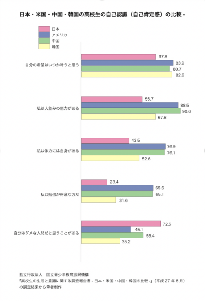 これらの結果には、自分のことを謙虚に表現する日本人の国民性の影響もありますが、これだけ如実に数値として現れると、何か別に問題があると考えざるを得ません。それが何なのか、考えなければならないでしょう。