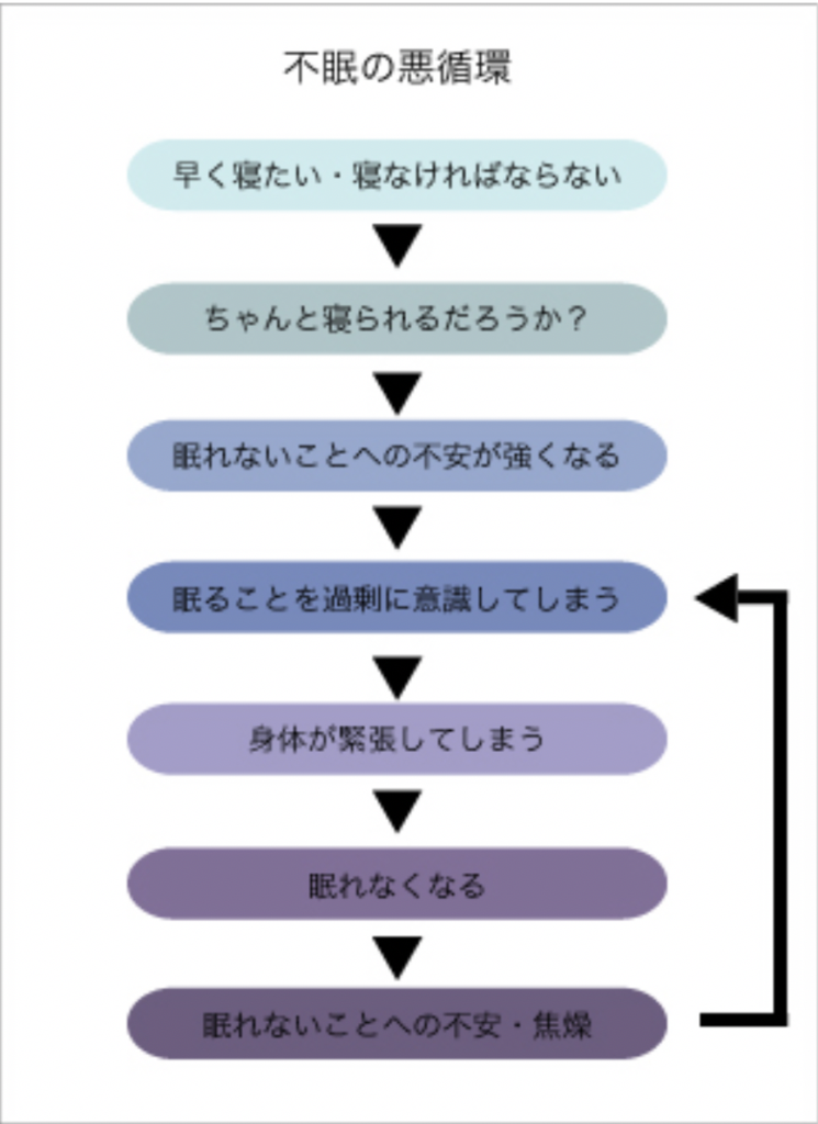 このように、不眠に対する不安や、睡眠に対する過剰な努力によって、身体的な緊張が(無意識に)生じ、それによって眠れなくなり、さらに眠るための努力をしてしまい緊張して眠れなくなる、という悪循環に陥ってしまう場合があります。また、こうした悪循環の体験が、寝室やベッドに入ること自体に不安を覚えさせるようになり、不眠を慢性化させてしまいます。このような体験のある方も少なくないのではないでしょうか?