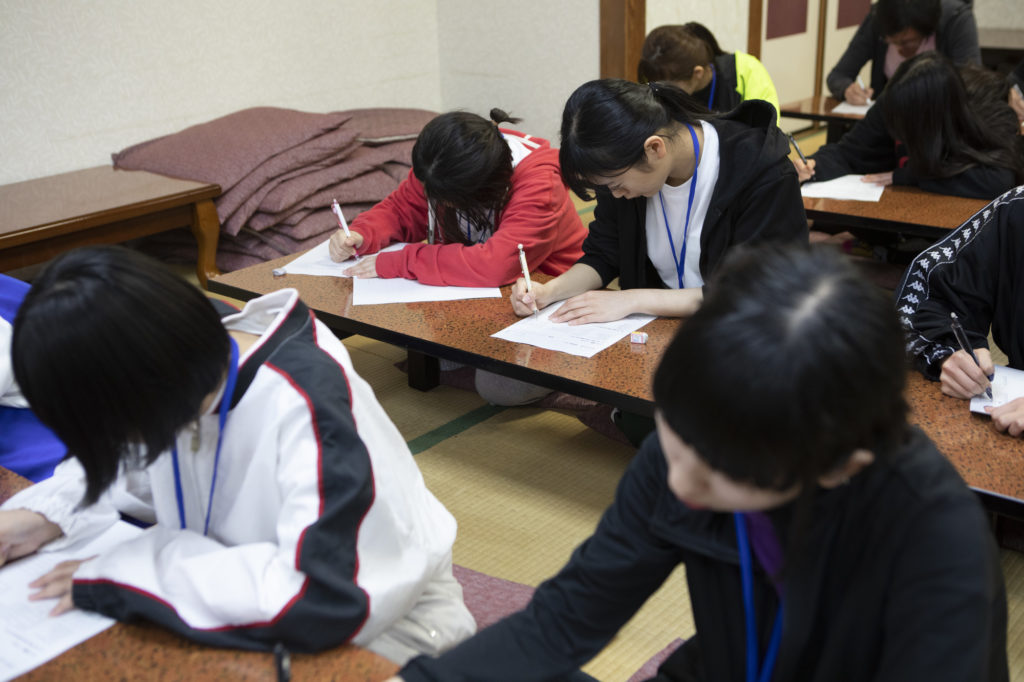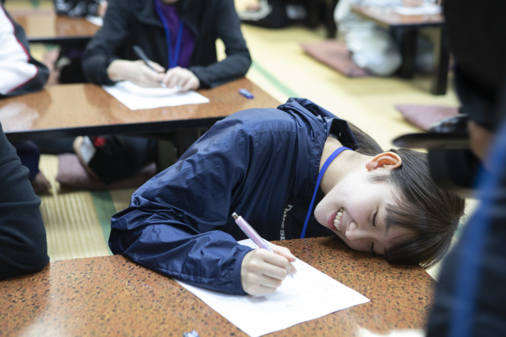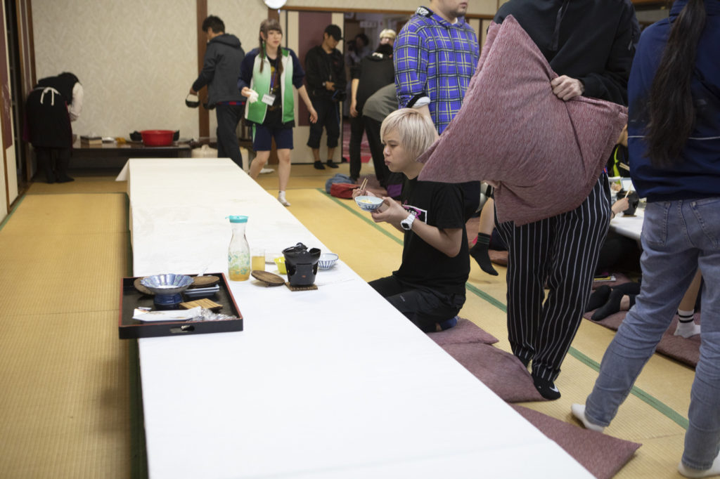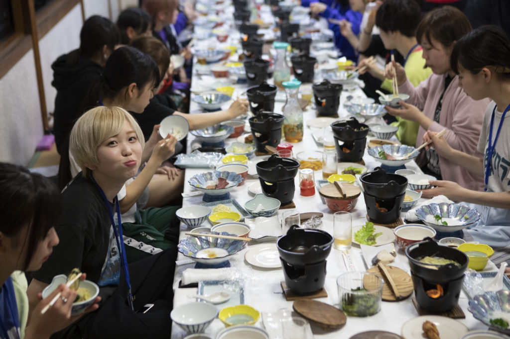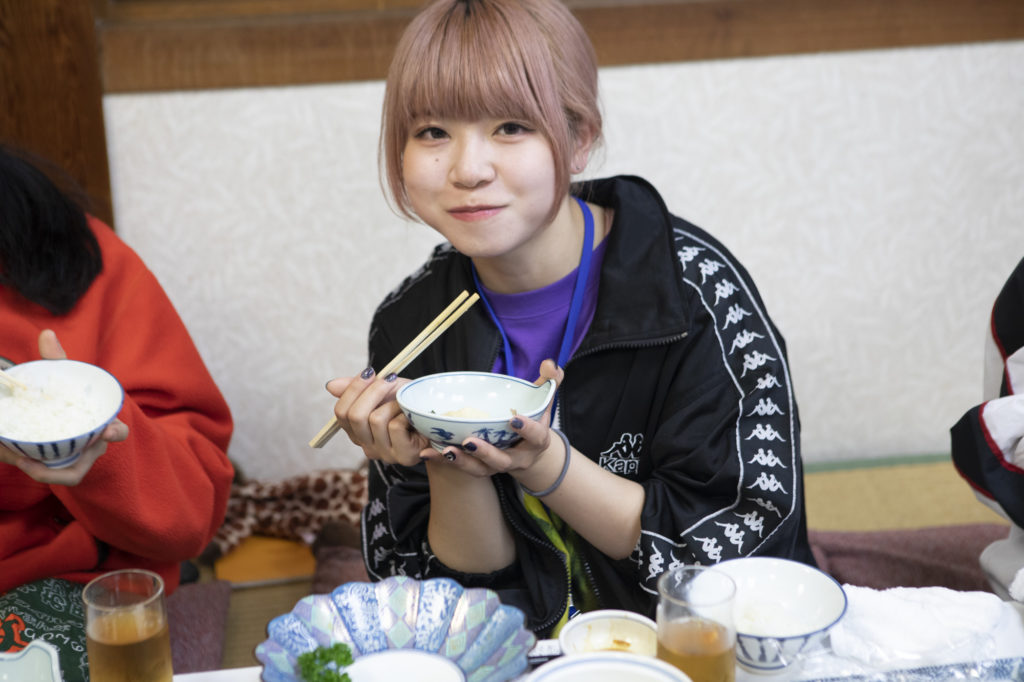スポーツセンターから定宿の太公望にバスで移動すると夕食タイムへ。もつ鍋や唐揚げ、刺身、さわらなど10近いおかずをそれぞれが口に運んだ。日常生活で野菜や刺身などを食べられないヤママチミキも見事完食してみせた。