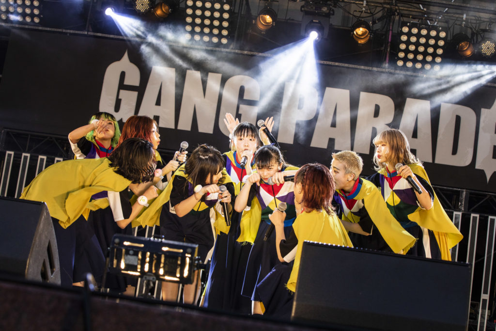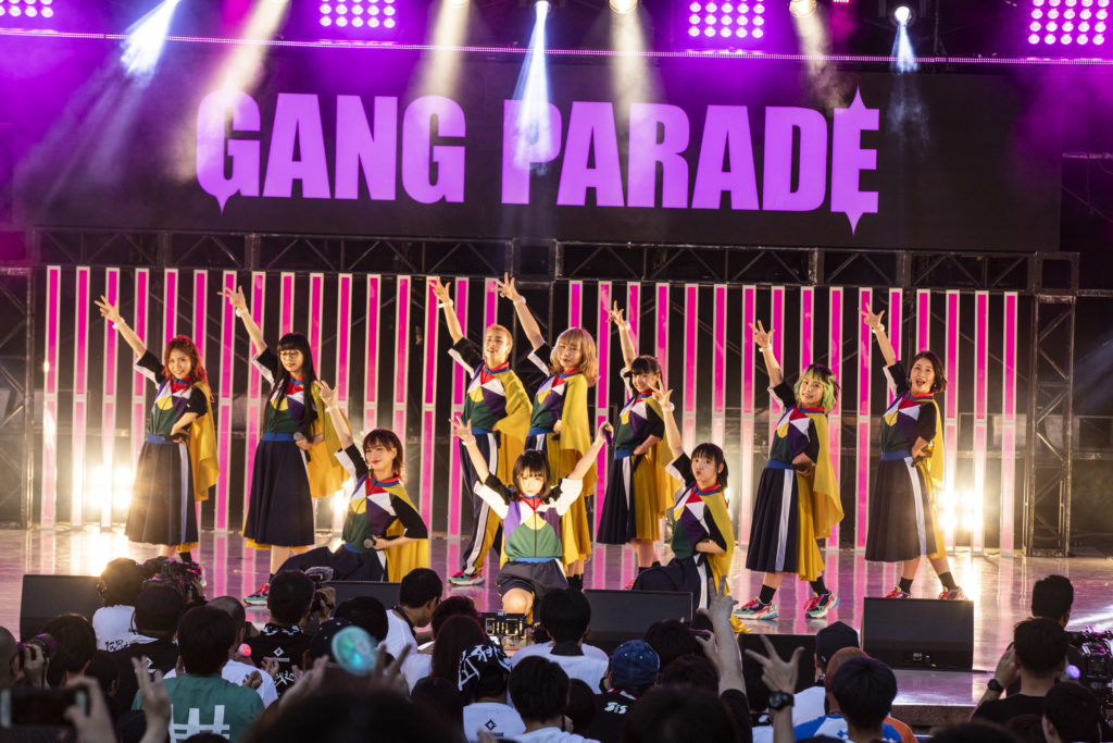 メンバー1人1人が自己紹介をすると、ハルナ・バッ・チーンが「宣誓! 我々、GANG PARADE一同は、この青空の下で今日を迎えられたこと、今日ここ日比谷野音に集まってくださったみなさんに感謝し、この10人で最高の遊び場を作ることをここに誓います。遊び人のみなさん、準備はいいですか? いいですか? いいですかーーー?」と客席を盛り上げ、ギャンパレの前身グループPOP時代のシングル曲「Happy Lucky Kirakira Lucky 」へ。ココ・パーティン・ココが「今日はギャンパレがみんなを世界で1番幸せにするぞー!」と叫び「QUEEN OF POP」へ、そして「3rd FLOOR BOYFRIEND」では〈子猫ちゃん〉という歌詞に続けて遊び人が「にゃー」と叫ぶなど会場は一体感を見せた。チアリーディング風な掛け声も印象的な「Are you kidding?」、カミヤサキがBiSへレンタルトレードしていた時期にリリースされた「Beyond the Mountain」をパフォーマンスすると、ギャンパレ名物ともいえるコントへ。