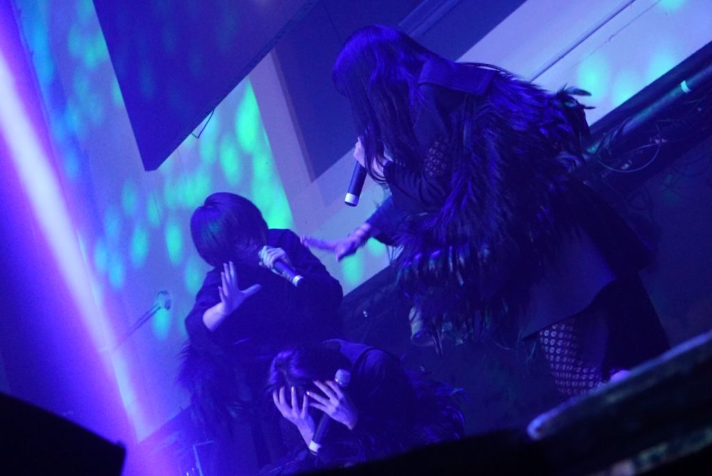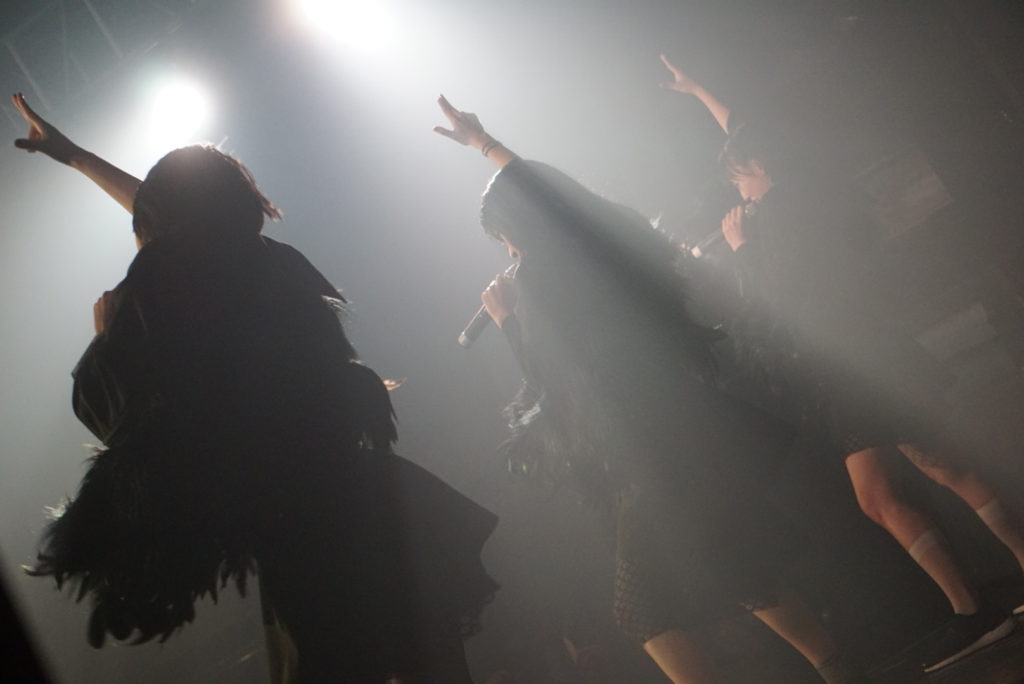 初めに披露したのは「Block System」という曲。頭を貫くような轟音の中、お披露目ライヴとは思えない程の妖艶なダンスを3人が魅せる。「壮大だけど、距離のない状態」というグループ名に込められた意味をまさに体現するような、未知の体験に観客は圧倒させられた。2曲目の「Anything」に入り、その轟音はさらにうねりを増していく。新メンバーの小林潤(こばやしじゅん)と伊吹咲蘭(いぶきさら)の2人は、お披露目ライヴという緊張を全く感じさせない程の完成度の高さを見せ、会場を驚かせた。