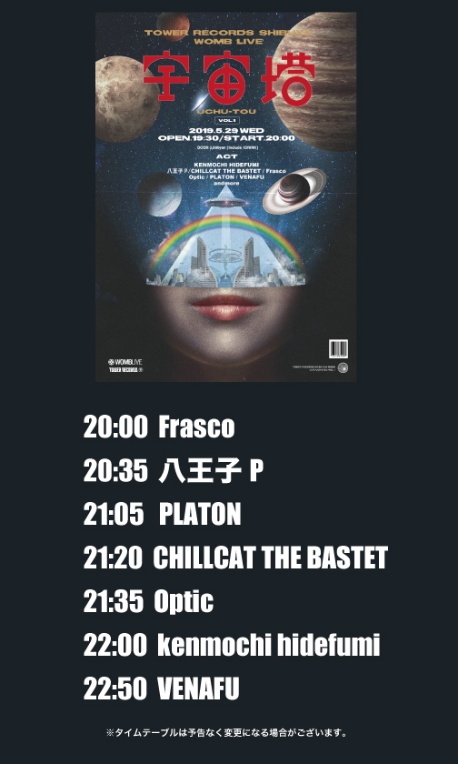 ここは、リアルな音楽体験を気軽にできる場所。そして、新しい音楽との出会いの場所。タワーレコード渋谷店と渋谷のクラブWOMBLIVEがプッシュするアーティストを軸に、毎月シリーズ開催するイベント、それが〈宇宙塔〉!!