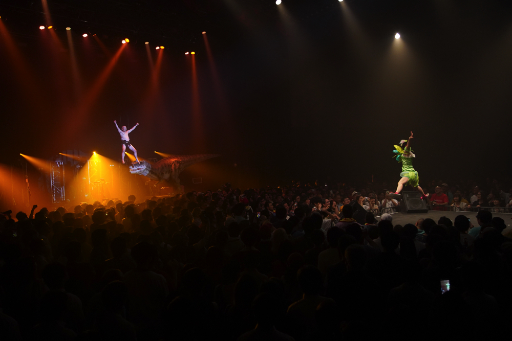 照明が落ちると、ヒーローに扮した眉村が恐竜に立ち向かう動画でライヴはスタート。動画が流れ終わると、舞台上の幕に光があたり恐竜に乗った眉村のシルエットが浮かび上がると、会場はどよめきと興奮に揺れた。