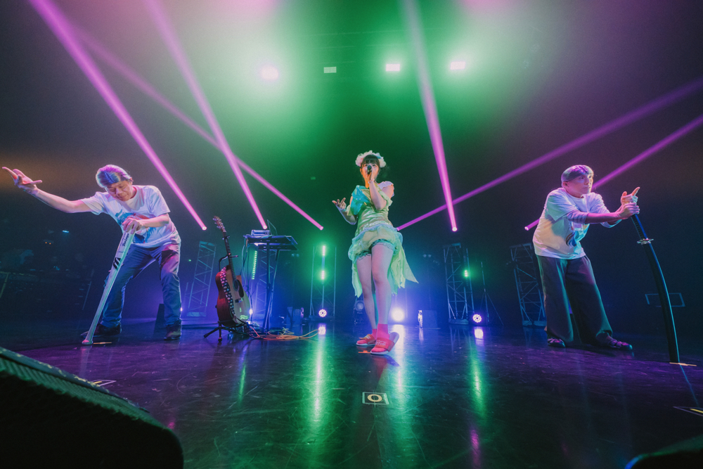 その後の「ピッコロ虫」では即興の歌詞で盛り上げつつ、「夢みたいな心地だが、もっと、もっと、、」と眉村の気持ちを弾き語ると、会場は幸せな一体感に包まれる。そんなほっこりした時間もつかの間、次の曲「荻窪選手権」では、眉村が尊敬すると語るクリトリック・リスことスギムがワイヤーで吊るされて登場。さらに倒したはずの恐竜も出てきてステージはカオスな状態へ。しかしそんなステージも、持ち前のチャーミングさでエンターテイメントとしてまとめ上げるのが眉村のすごい所なのだろう。
