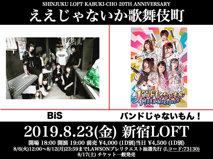 8月23日に、新宿LOFTの歌舞伎町移転20周年を記念し、BiSとバンドじゃないもん!MAXX NAKAYOSHIの2マンライヴが開催される。