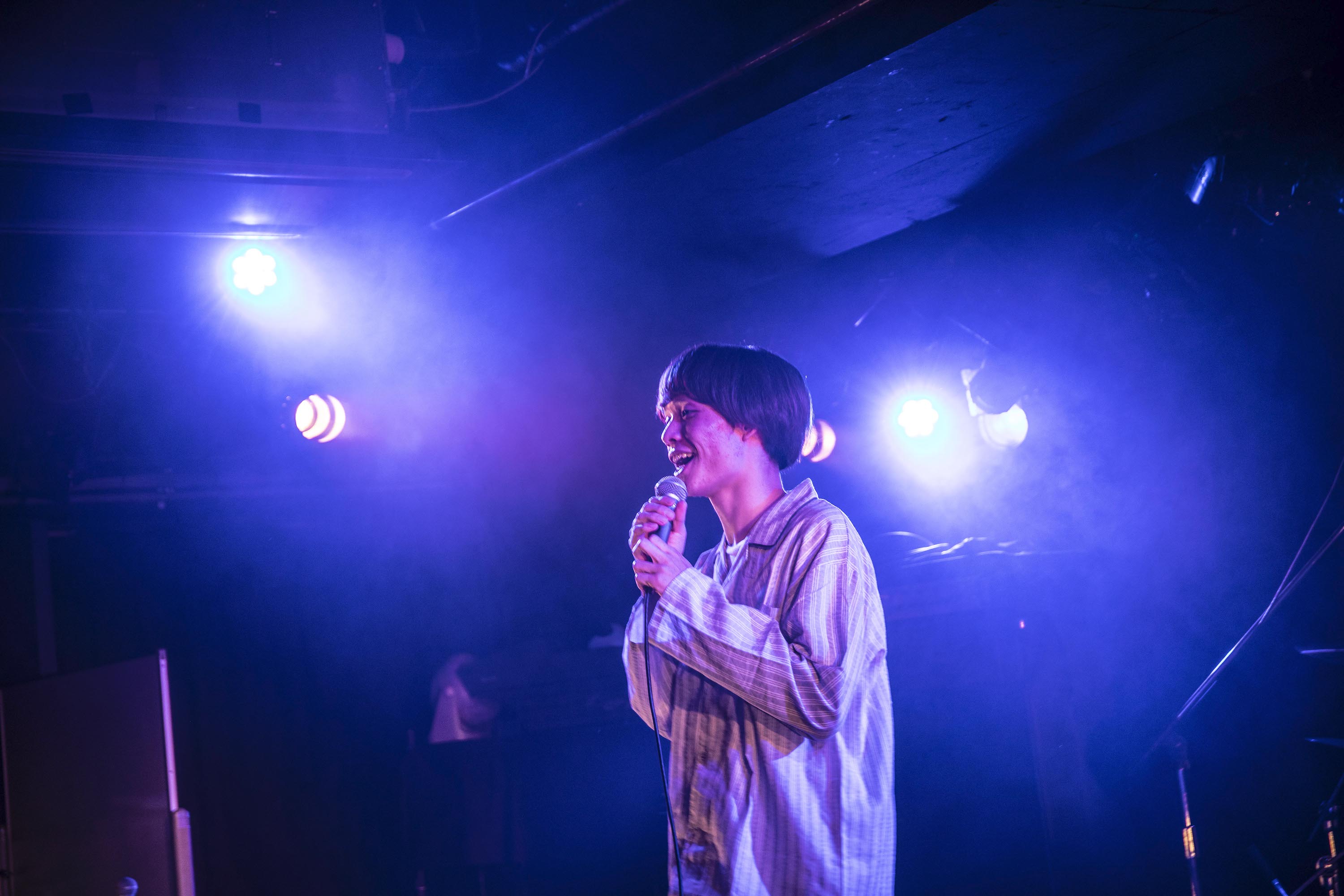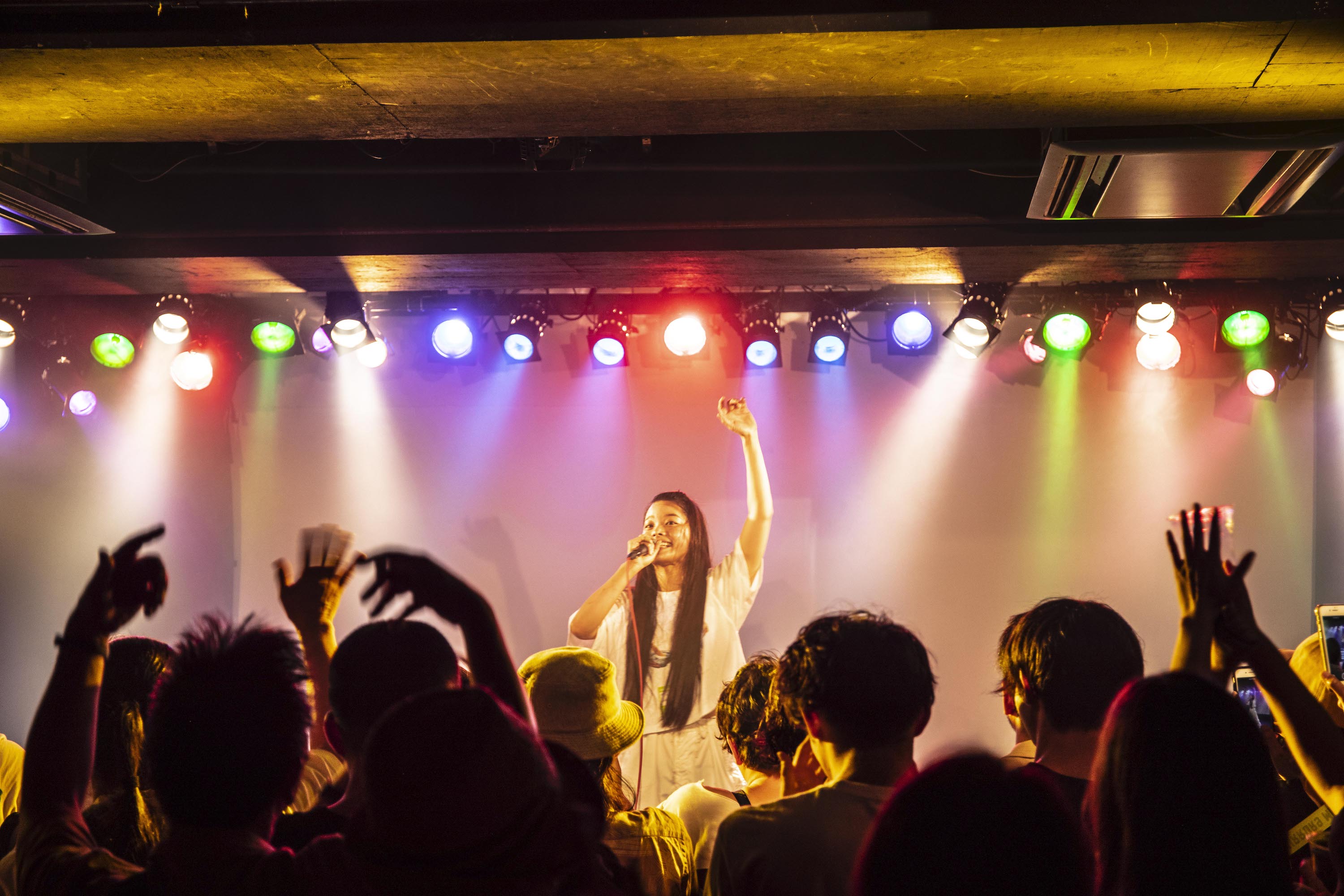 続いて本日初のLIVE STAGEに登場したのはぎゅうにゅうとたましい。パジャマ姿でゆらゆらと歩きながらのパフォーマンスだ。観客は、ノイズ混じりのエネルギッシュなトラックに体を揺らしながら、その上に乗るゆるい歌詞のラップとのギャップを楽しんでいるようだった。全6曲を披露すると、「今日は最後までくつろいでいきましょう!」とライヴを締めた。