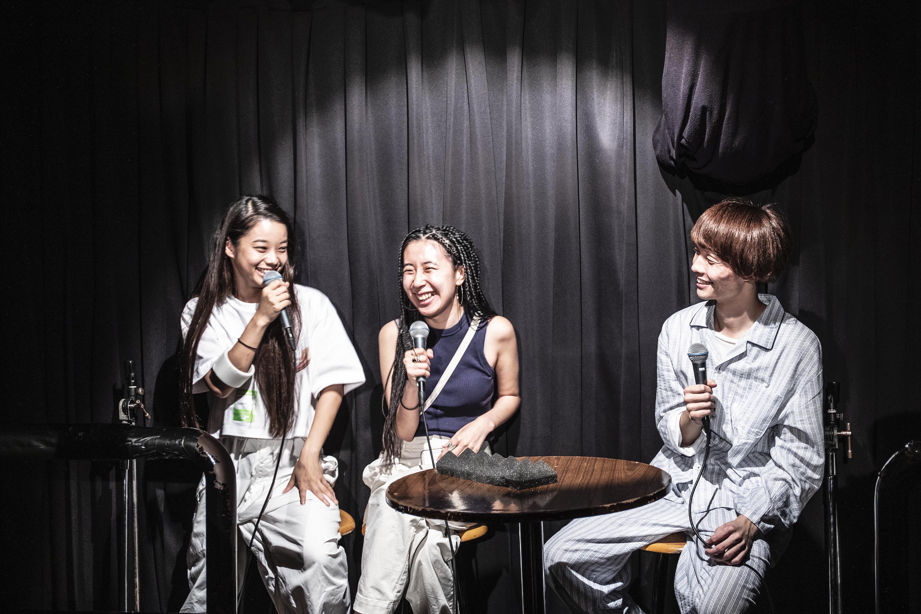 20時15分からは一転し、社会問題と向き合う人のクラウドファンディングプラットフォームを運営する株式会社GoodMorningの代表酒向萌実、先ほどライヴを行ったばかりのぎゅうにゅうとたましいとxiangyu。意外にも同学年だという3人が、仕事や世代感について話し合った。25の誕生日に急に社長のオファーを受けたという酒向に終始興味津々の2人だった。