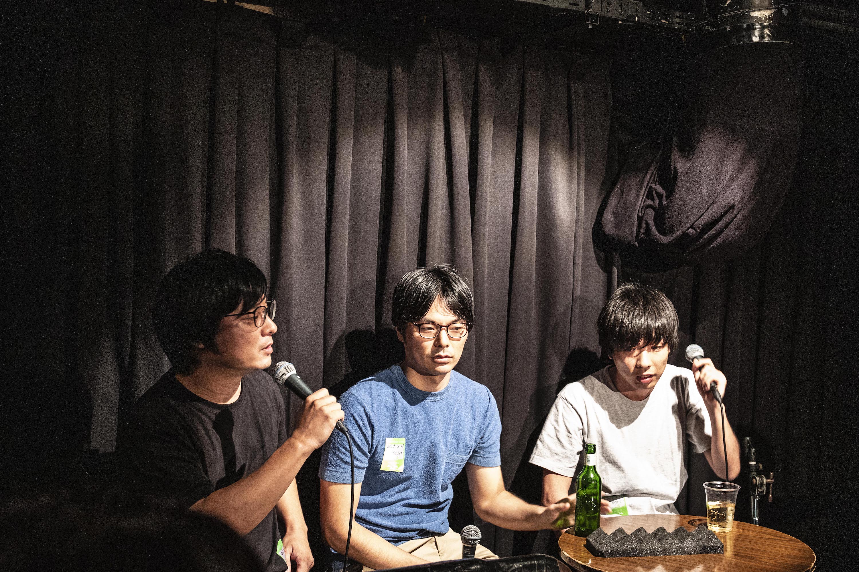 20時55分からは西澤裕郎(StoryWriter)を司会に迎え、先ほどライヴを行ったトリプルファイヤーの吉田(Vo)、鳥居(Gt)が、xiangyuが気になっているという歌詞の世界観についてのトークをおこなった。トリプルファイヤーは吉田の書くニヒルな歌詞が特徴の一つだが、意外にも1人称は吉田ではない場合もあるとのこと。しかし鳥居は曲を作った時には想像もしなかったような歌詞が乗ることに疑問を感じているようで、吉田が「コミュニケーション不足ですね」とコメントすると会場は笑いに包まれた。
