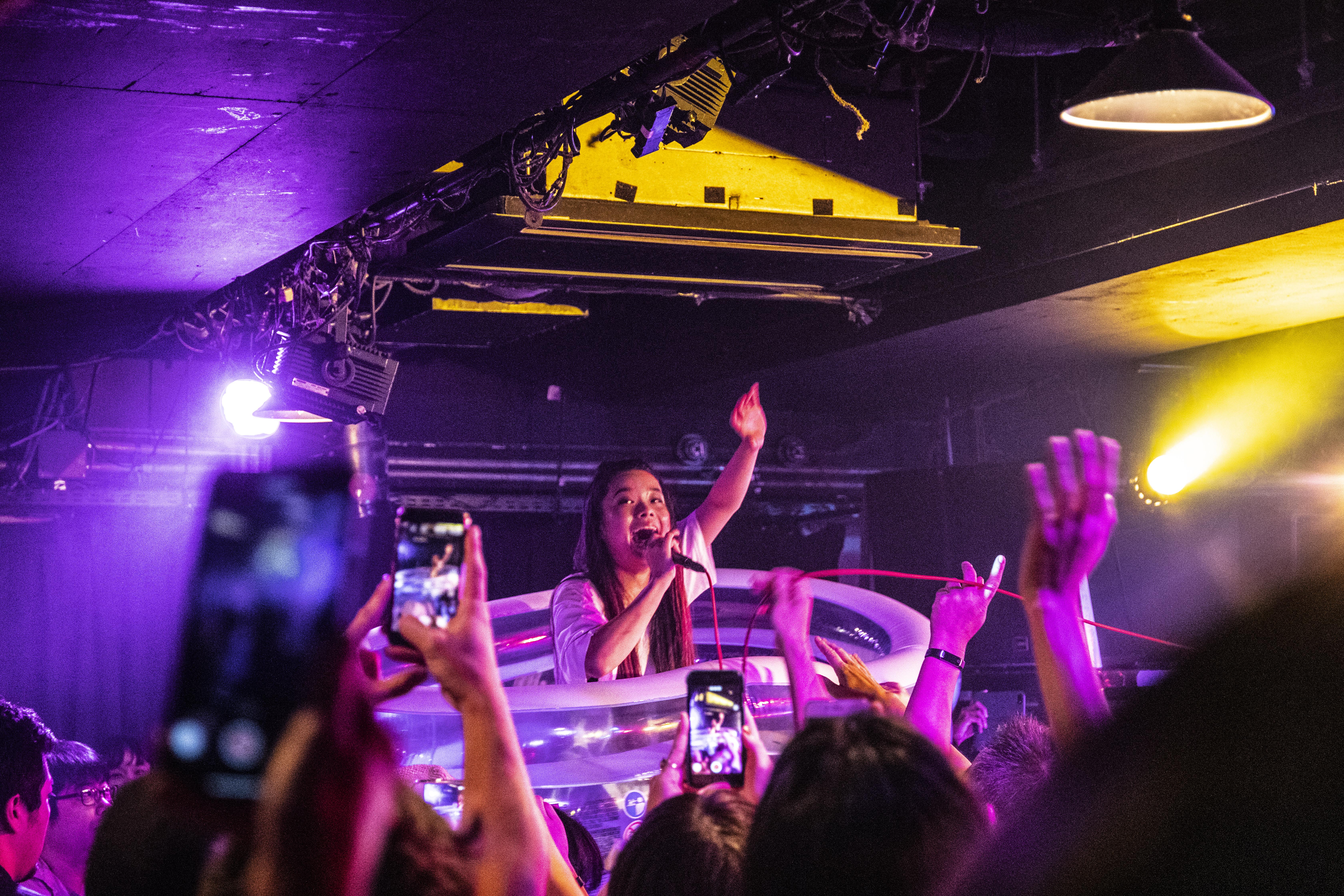 そして最後に、本日の主役xiangyuが登場。1曲目「ヒューマンエボリューション」からエネルギー全開のパフォーマンスを魅せる。息を切らしながら続けた「Go Mistake」では、ゴミ処理場の映像のVJをバックにサビではその縦ノリなビートに会場が揺れると、新曲「ピアノダンパー激似しめ鯖」へ。ゴリゴリの低音にピアノダンパーとしめ鯖が似ているという謎な歌詞が乗るまさにxiangyuらしさが溢れる1曲。続けて、1年前に初めてリリースした曲「プーパッポンカリー」や「菌根菌」という定番曲で1年間の成長を見せつけるなど、パワーアップしたxiangyuが魅せる生命力に会場は一体となって盛り上がった。
