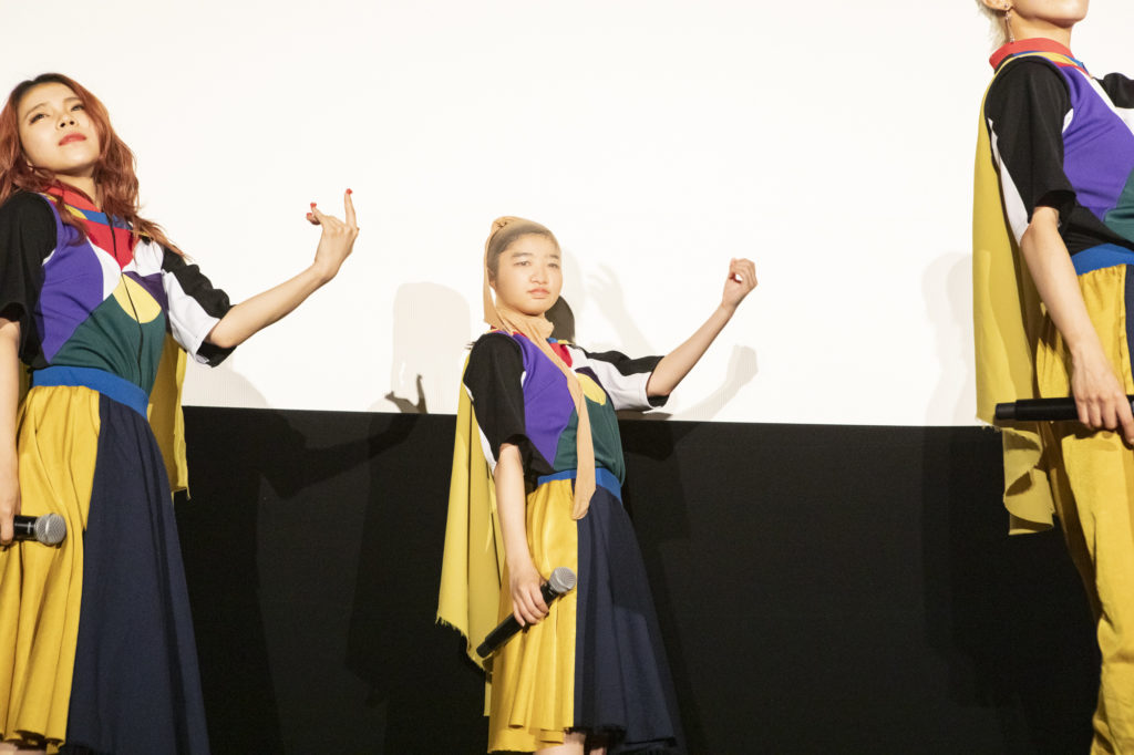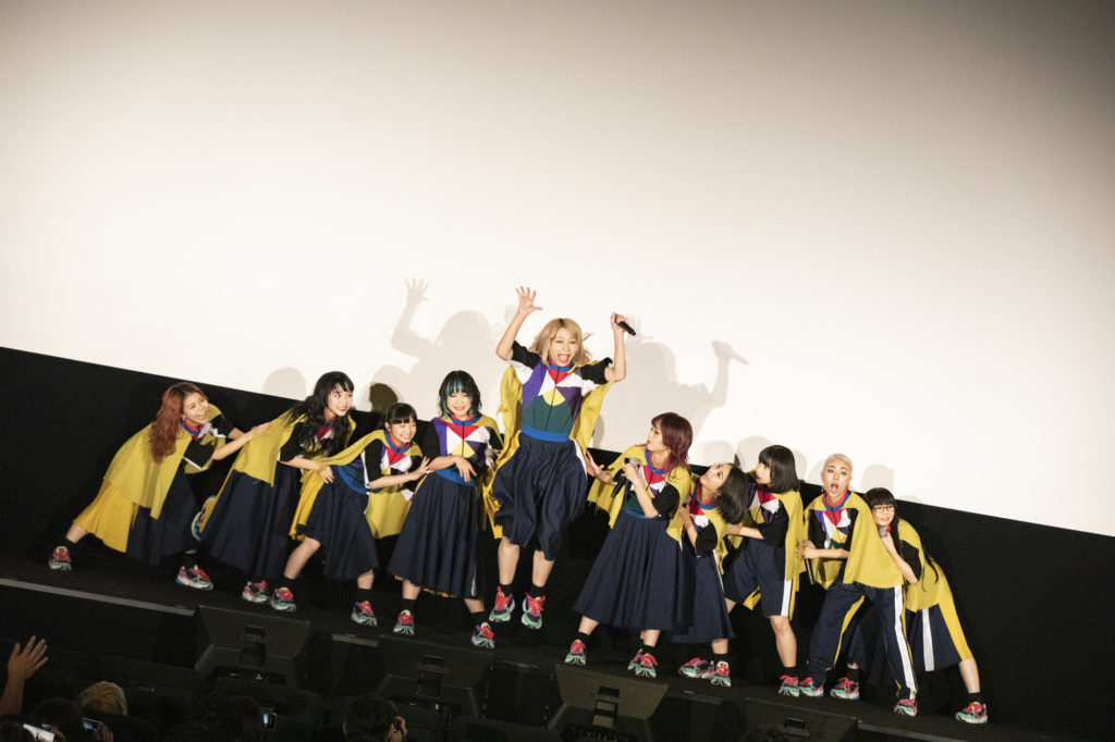 18時50分になると、お馴染のSEが流れ10人のメンバーが舞台上に登場。「私たちエンジョイプレイ、みんなの遊び場、GANG PARADEです!」と全員で挨拶をすると、「日比谷野音から3ヶ月。さらなる高みを目指し歌います」とカミヤサキが挨拶をし、「Beyond the Mountain」でミニライブがスタート。映画館のステージという普段とは違うシチュエーションながら、「Are you kidding?」、「FOUL」、「WE ARE the IDOL」の4曲を全身全霊でパフォーマンス。「WE ARE the IDOL」でナルハワールドがメンバーに囲まれパンストを被され歌い始めると、会場はどよめきを見せた。遊び人たちも椅子に座りながら振り付けをしたり、メンバーの名前コールをするなど、いつもとは違う盛り上がりを見せ、最後はナルハがかぶっていたパンストを客席に投げ込みミニライブは終了した。