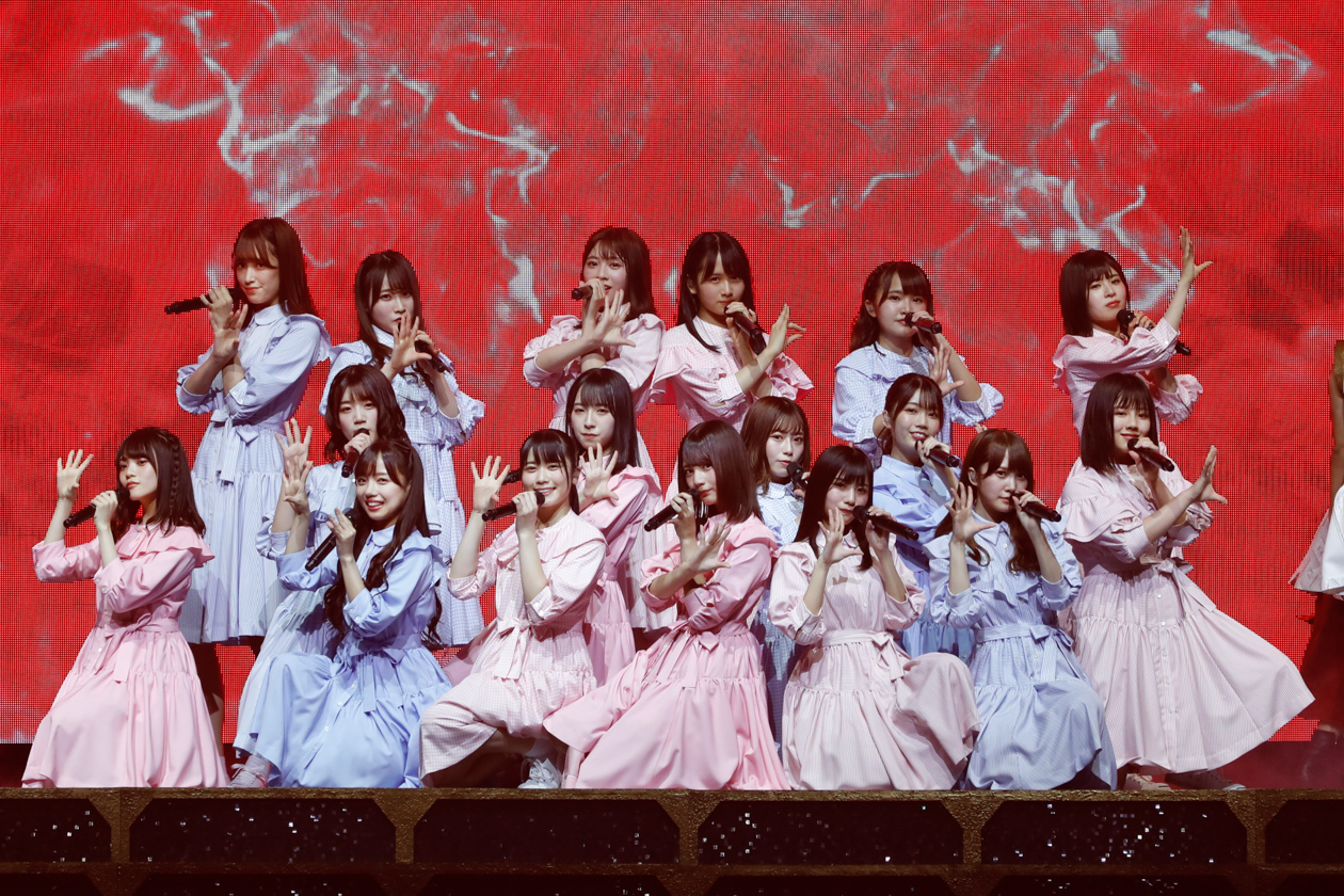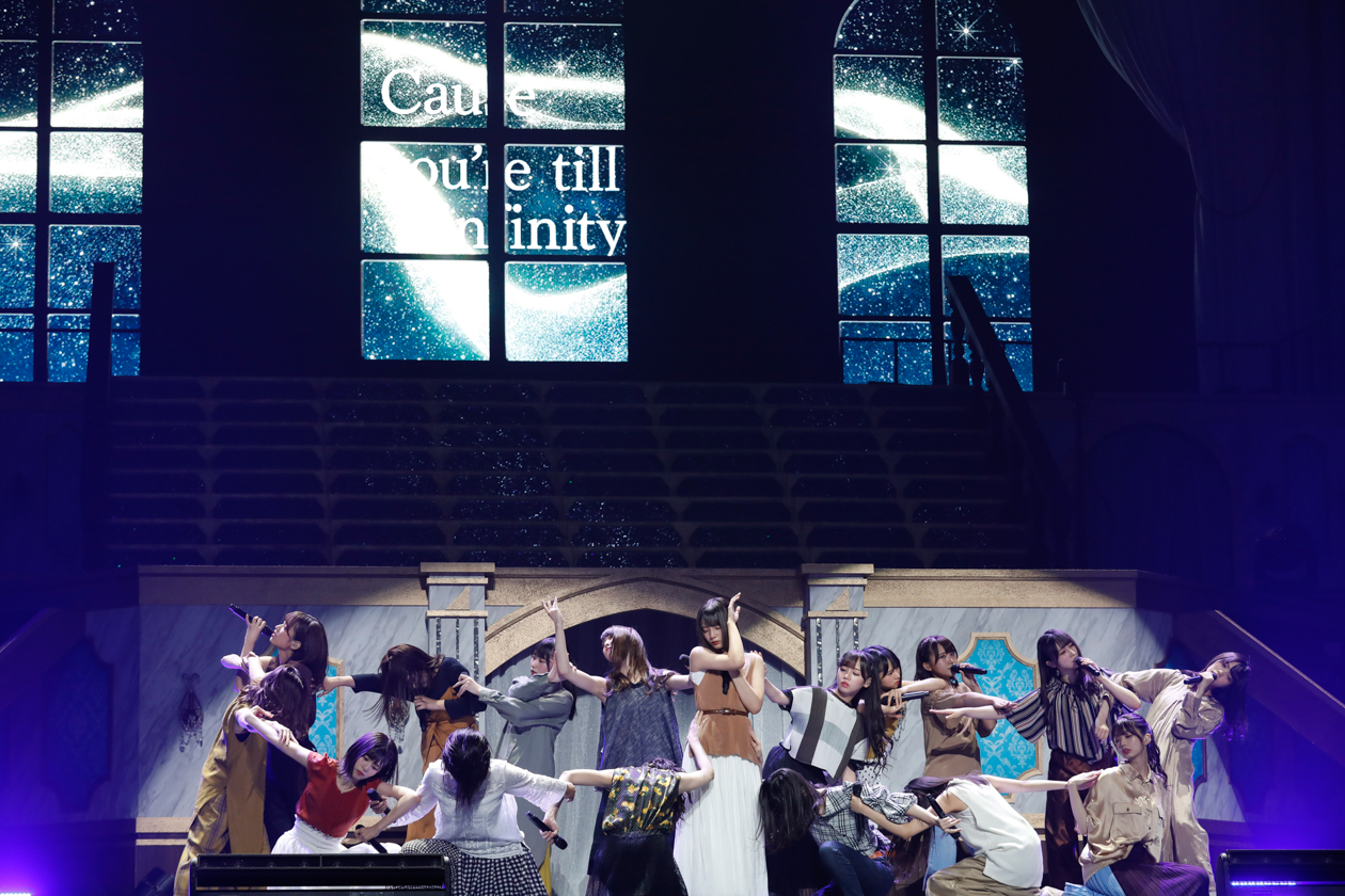 アンコールでは、一期生によるライヴ定番曲「誰よりも高く跳べ!」で客席は熱狂的な盛り上がりに。二期生が歌う「半分の記憶」へと続き、ライヴはクライマックスへ。最後は「私たちの夢を歌った曲です」との言葉から、「約束の卵」が歌われた。ペンライトを振りながら、センターステージへ歩いて行き、会場中のお客さんに感謝するように歌うメンバーたち。