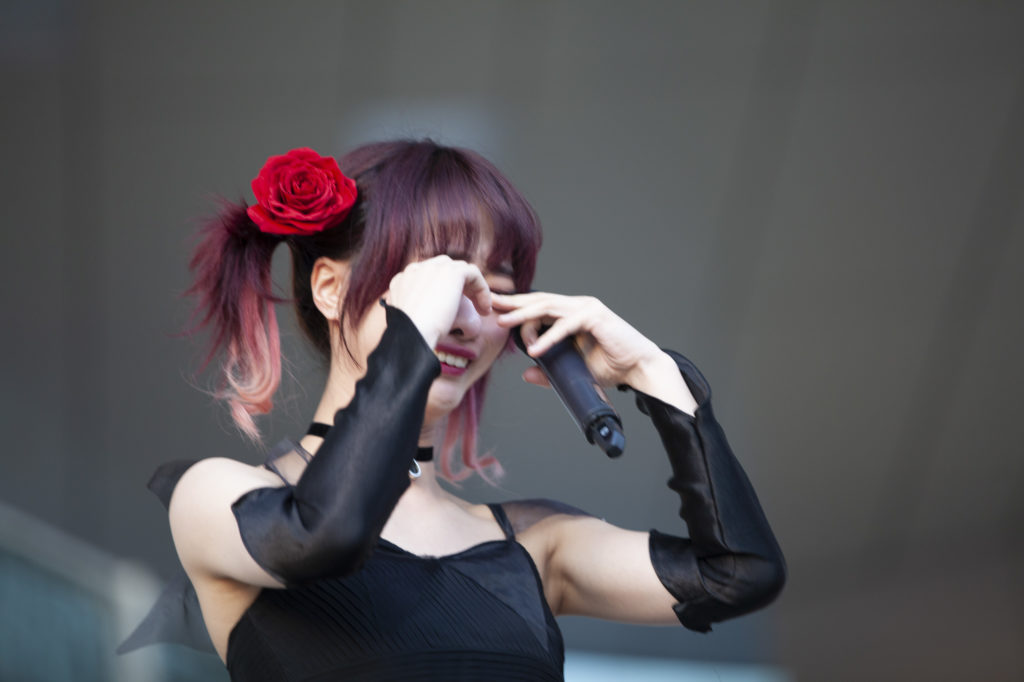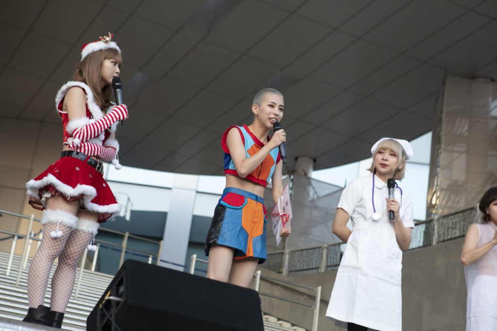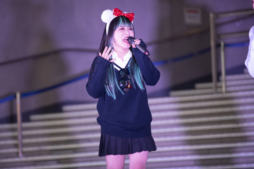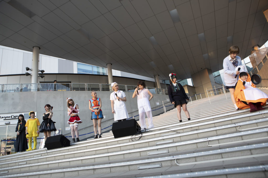 15時になりSEが流れると、メンバー10人が登場。「私たち、エンジョイプレイ、みんなの遊び場、GANG PARADEです!」と挨拶をすると、メジャーデビューシングル曲「ブランニューパレード」からミニライヴがスタート。晴天の中、伸びやかに歌いダンスを披露すると、アルバム『LOVE PARADE』より「Wake up Beat!」へ。サビで手を上空にあげる部分では遊び人たちも一緒になってサビを真似し、一体感を生み出した。続いて「GANG PARADE」のイントロが流れると、カミヤサキが「今日は私たちと一緒に遊ぼうぜー!」と叫び、階段途中のステージを広く使いパフォーマンス。『LOVE PARADE』収録のユメノユア作詞曲「ALONE」を歌うと、ナルハワールドが「昨日全国各地にメンバーが回ってやったんですけど、たくさんお客さんが待ってくれていたり写真を撮ってくださり、楽しくやることができました。ニコ生も入ってくれていて、みなさんからの愛をたくさんもらったので、その何倍もの愛を返せるようにライヴをするので最後まで見ていてくれたら嬉しいです」とMCを行い、アルバム表題曲「らびゅ」をじっくりと歌い上げた。