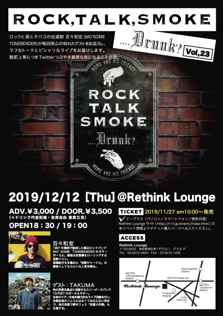 百々和宏(MO’SOME TONEBENDER)が主催するトーク&ライヴ・イベント〈Rock, Talk, Smoke….Drunk?〉の第23回が、12月12日(木)に東京・虎ノ門Rethink Loungeにて開催される。ゲストは10-FEETのTAKUMA。