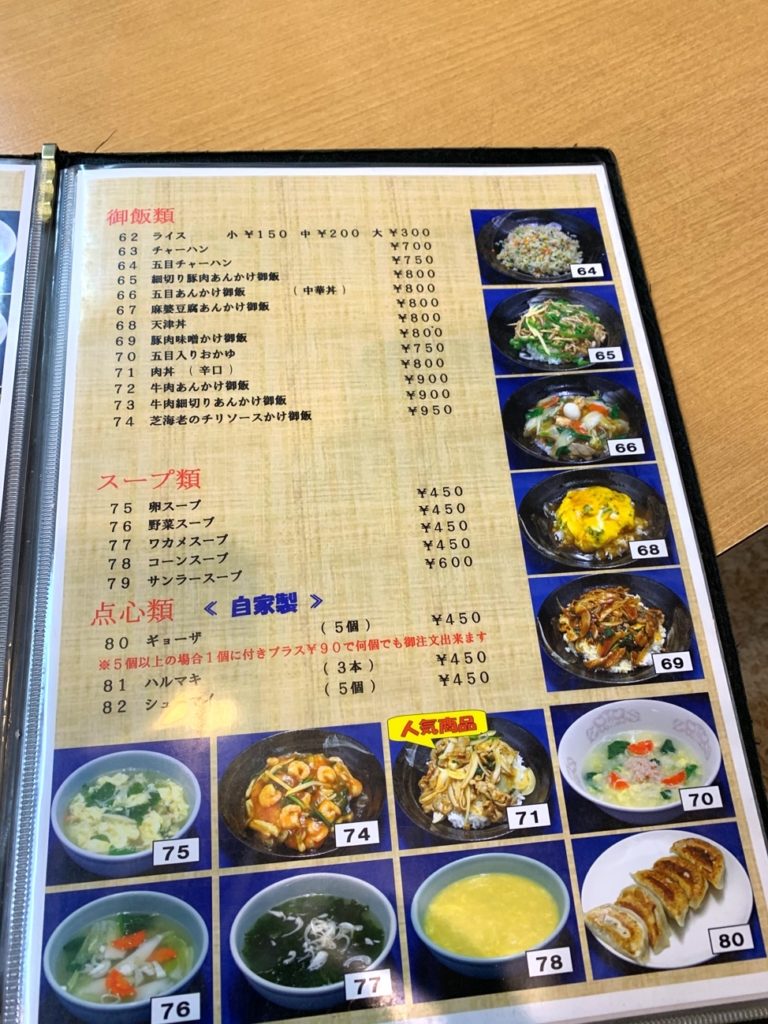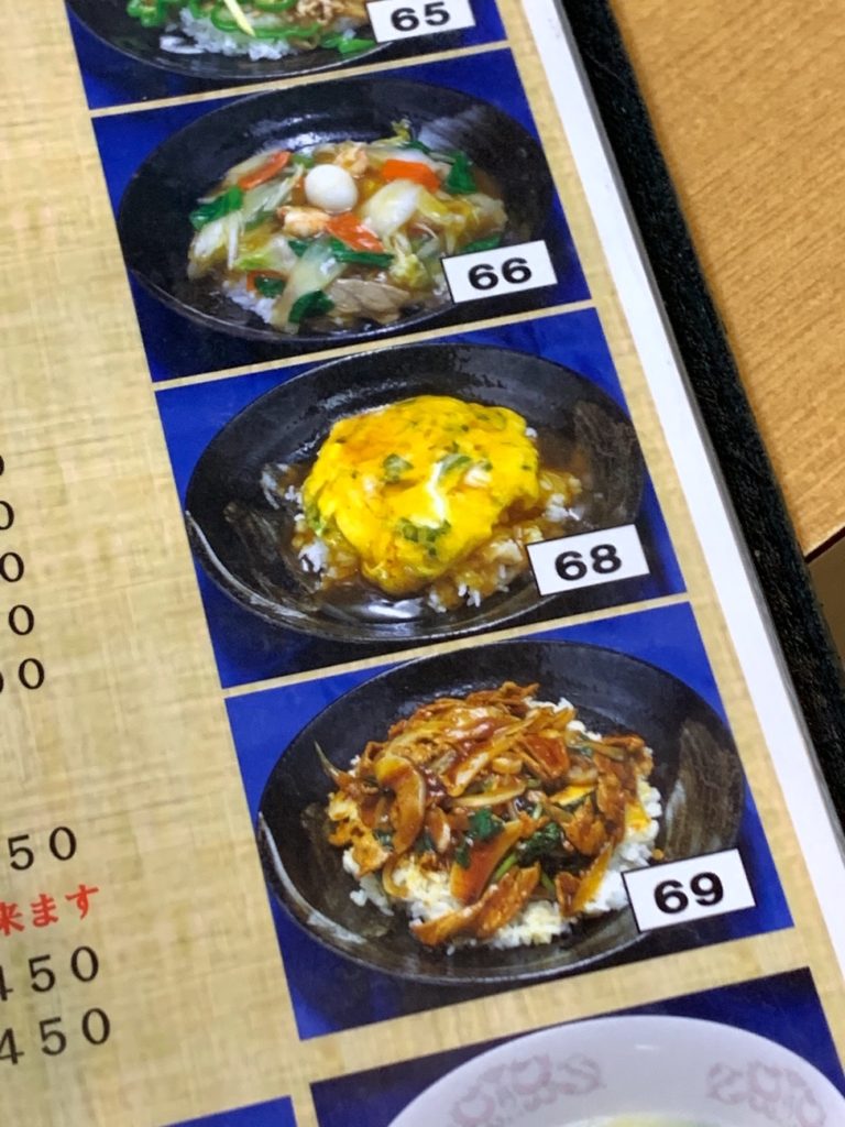 入店すると温かいお茶(たぶんジャスミンティ)かお水か訊いてくれる優しい奥さん。旦那さんが厨房にいて、二人で店を切り盛りしているのかな。ちょっと心にじんわり来るね。兎にも角にも、このお店には天津飯があるのか。これが毎回メニュー開くときのドキドキポイント。さて……。