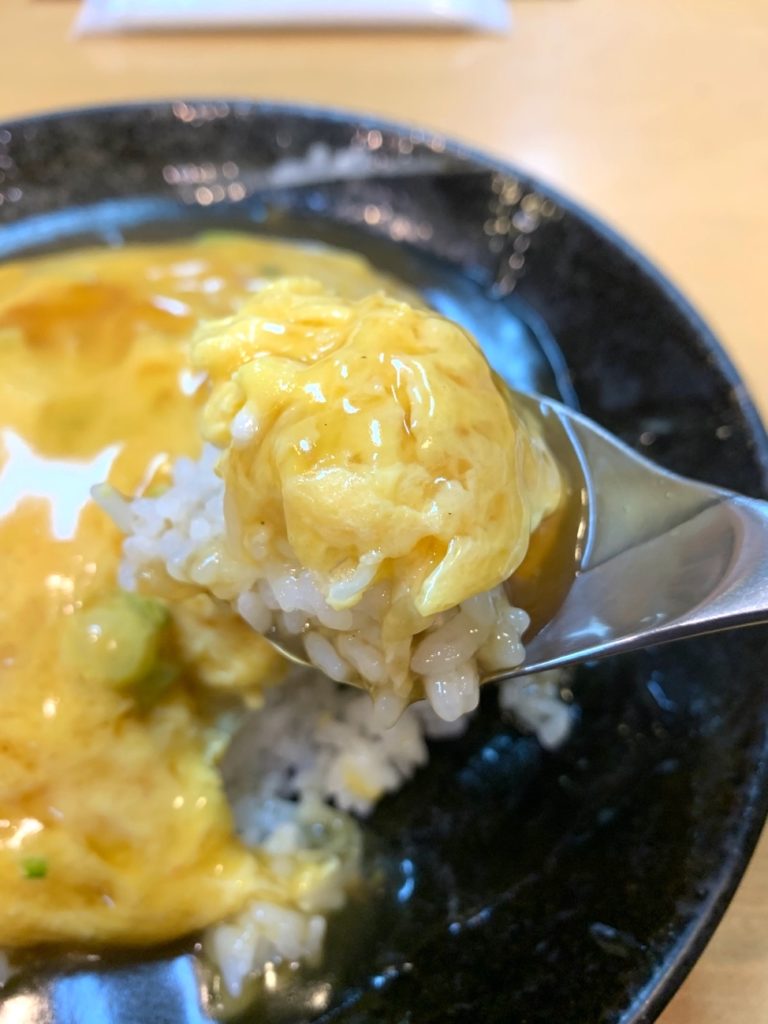 卵は見た目厚めだけどふわふわで、ちょっと高級なオムライスみたいなお上品な口触り。卵の中には火が通ってしなしなのネギと、写真では分かりづらいけどカニカマ。この2つは天津飯界隈では王道といえば王道の組み合わせ。なんと言うんでしょう、ちょっと酸味がある以外は全体的にどの食材が特に自己主張していると言うわけではないんだよね。な