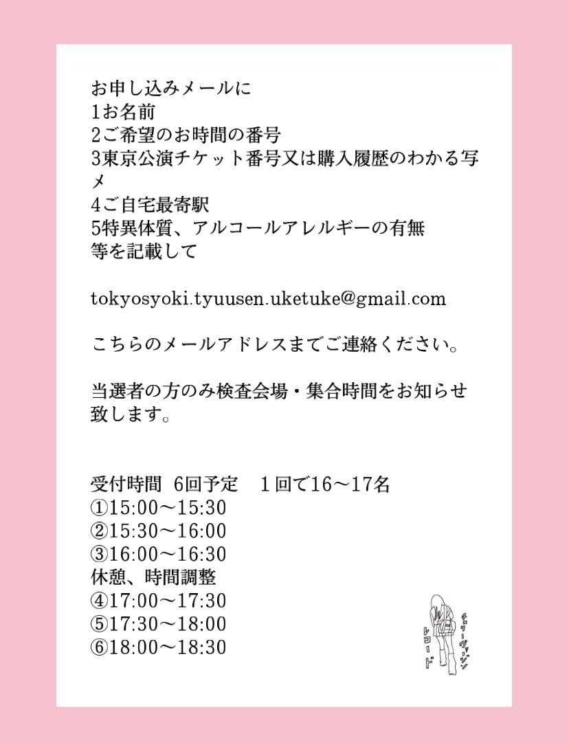 受診条件追加:東京公演のチケットをお持ちの方で、都内在住または、都内に通勤・通学をしている方としておりましたが、都内近郊にお住いの方も受付いたします。