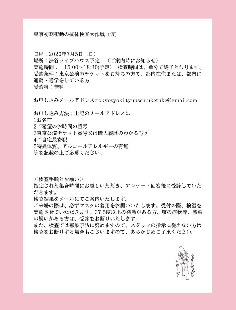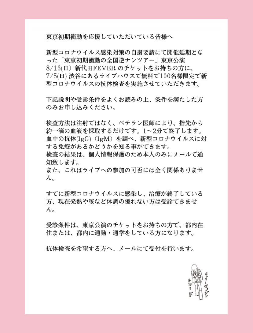 延期となった〈東京初期衝動の全国逆ナンツアー〉東京公演のチケットを持っている人を対象に、新型コロナウイルスの抗体検査を100名限定で無料で行われる。
