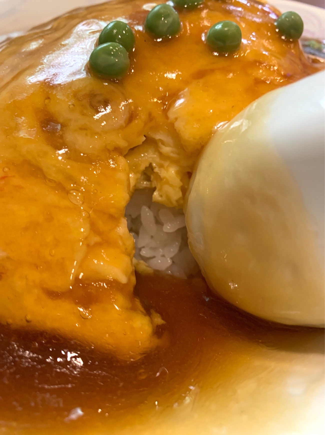 天津飯というマウンドに上がったグリンピース栄光ナイン、きっと大盤振る舞いなんだろうな。ありがとう、おばちゃん。いただきますぞ!
