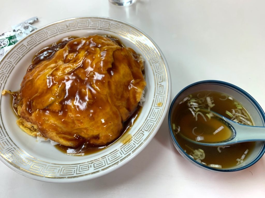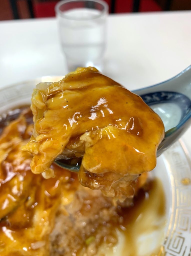 おお! まず初めに驚いたのがだいぶ大きめに切り分けられた具材! 玉ねぎと竹の子、椎茸くんが先陣を切ってお口に登場。これが全体に散りばめられており、しかも噛むたびに食材の美味しい味がじんわり口の中に広がる!だいぶ食感も残っているので常に楽しい! 具材を活かしきっているという感じだな! 何より蟹肉からもじんわり蟹のエキスが出てくるのがステキ! 天津飯なのにあんに負けずに色々な旨みが滲んでくる! 米はちょっと柔らかめで、あんは全体的に甘め。米も結構量があるんだけど、口の中に入るとあんに包まれた具材の旨さの方が強くて、米の存在感をかき消すほど。こりゃうんめえ!
