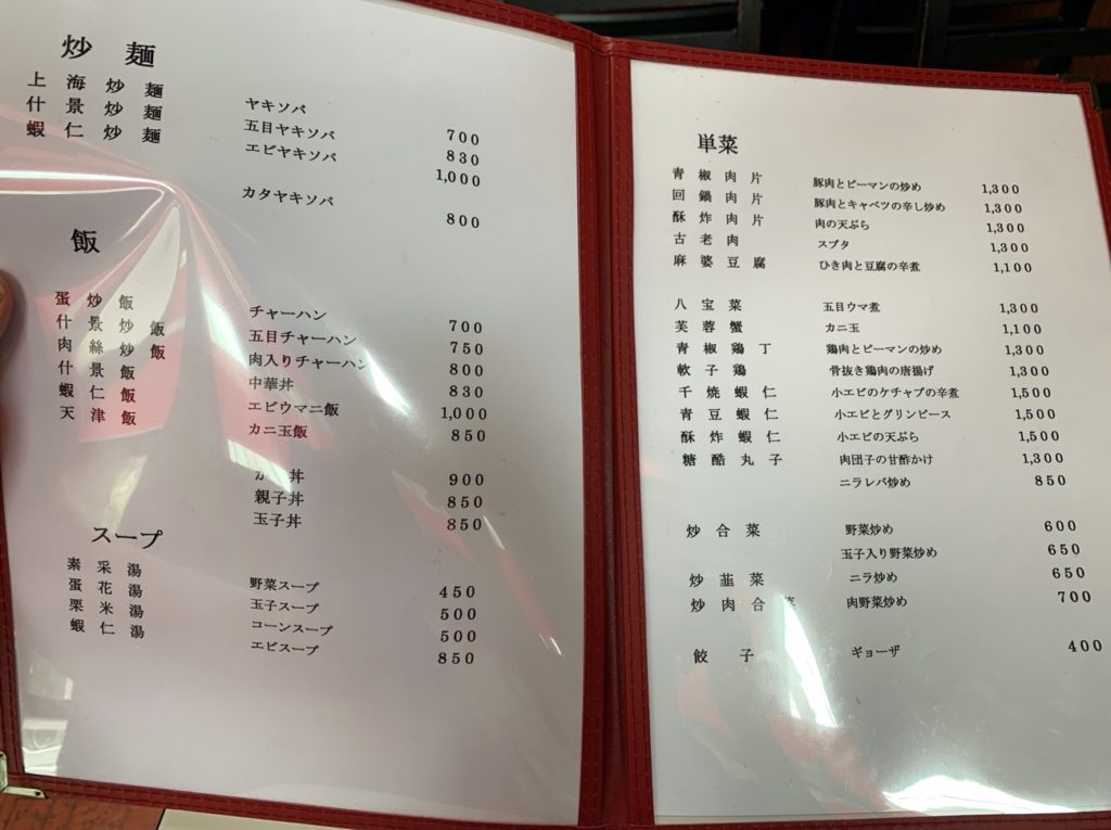 早速メニューを拝観。東京の町中華でさえ相当なお値段に感じて気後れしてしまうけど、田舎者の血。天津飯の上の「エビウマニ飯」にそそられつつも、しっかり天津飯を注文させていただく。うま煮ってよく目にするけど、なんて自信に溢れた料理名なんだろう……。