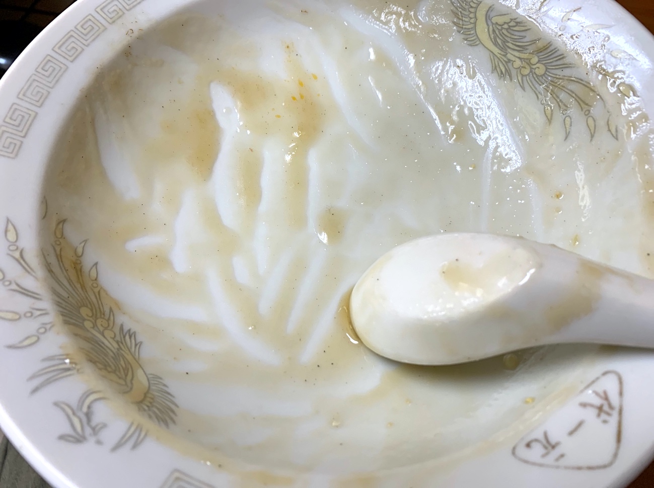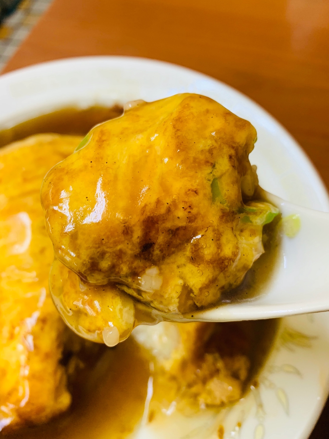 さて、一口を口に運んでみると卵が香ばしい! 油少なめで卵を炒めると焦げ目がつくらしいけど、そういう香ばしさ出しも計算されてのことなのか! 口の中が香りいっぱいで嬉しい! そして、ちょっと塩味が強めの醤油ベースのあん。ちょっと胡椒も効いててスパイシーだけど、夏はそれが一層嬉しいし白米もすすむ。具材はネギと蟹肉というシンプルな組み合わせではあるけど、それはそれでシンプルな味のみで勝負する感じが素敵! 素朴で優しいご主人夫婦の人柄でもあるかもしれない。蟹肉もしっかり味がしているし、ちょっと単調な味付けも酢やラー油で味変するたびに、天津飯本来の違う旨さが際立つ! 絶品! 美味すぎて、周りの何もかも輝いて手を振っているように見える!