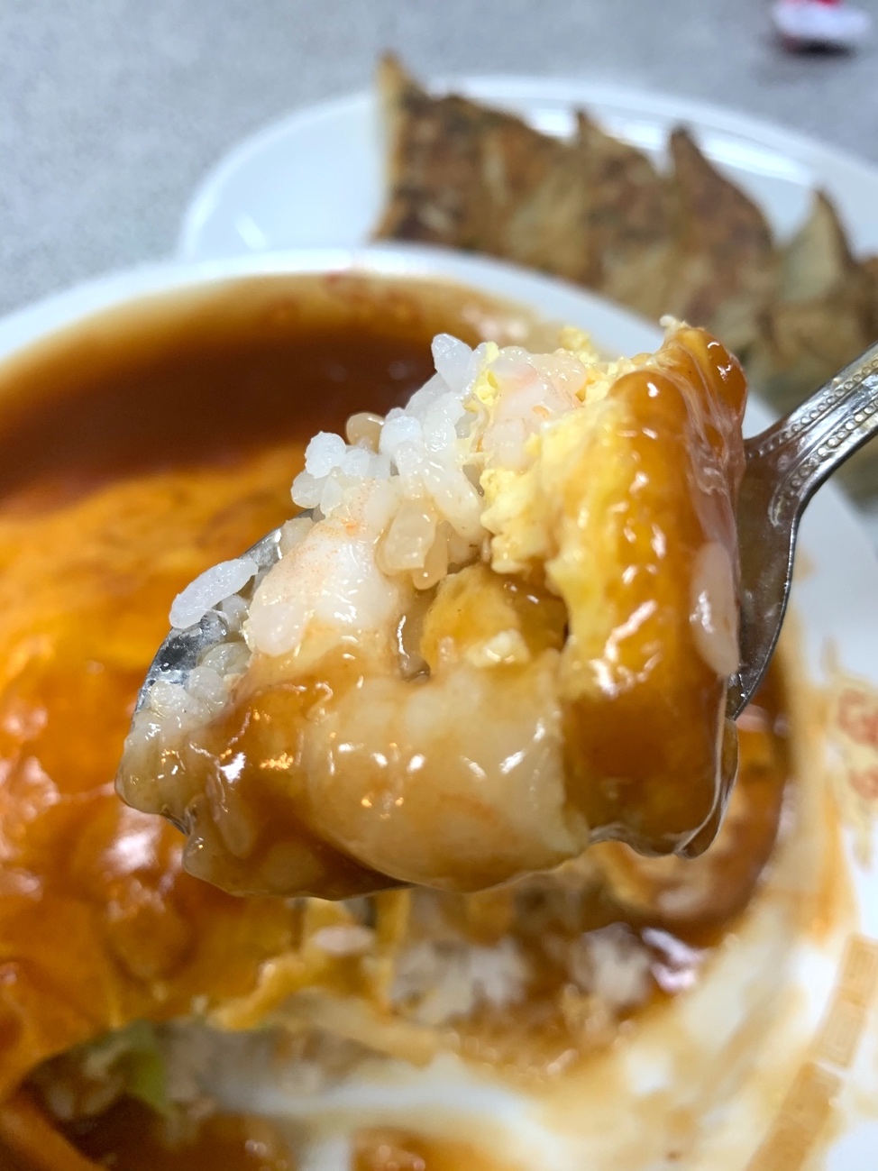 ふむ。一口目は、やはり醤油ベースのあんの味が口全体に広がる。予想はできていたことだけど、やはり東北あるあるのしょっぱめの濃口の味付け! なかなかのアタックです。しかし、徐々に広がってくる卵の甘さ! この甘さと塩味の融合が良いバランス! そういう意味では、天津飯って東北人の好きな味付けにあたるのではないだろうか。卵はニラ玉ばりの固さでふわふわ感はないけど、日本人的な白米に合う卵料理の食感を醸し出す! あゝ、オムライスや天津飯にふわふわの卵が流行り始めたのはいつからだろう? 卵が固くたっていいじゃないか! そして、ほのかに香る海鮮の味……。まさかこれは! 何よりも良かったのが具材。刻みねぎ、竹の子と人参の千切り、椎茸、そしてそう、剥き海老!