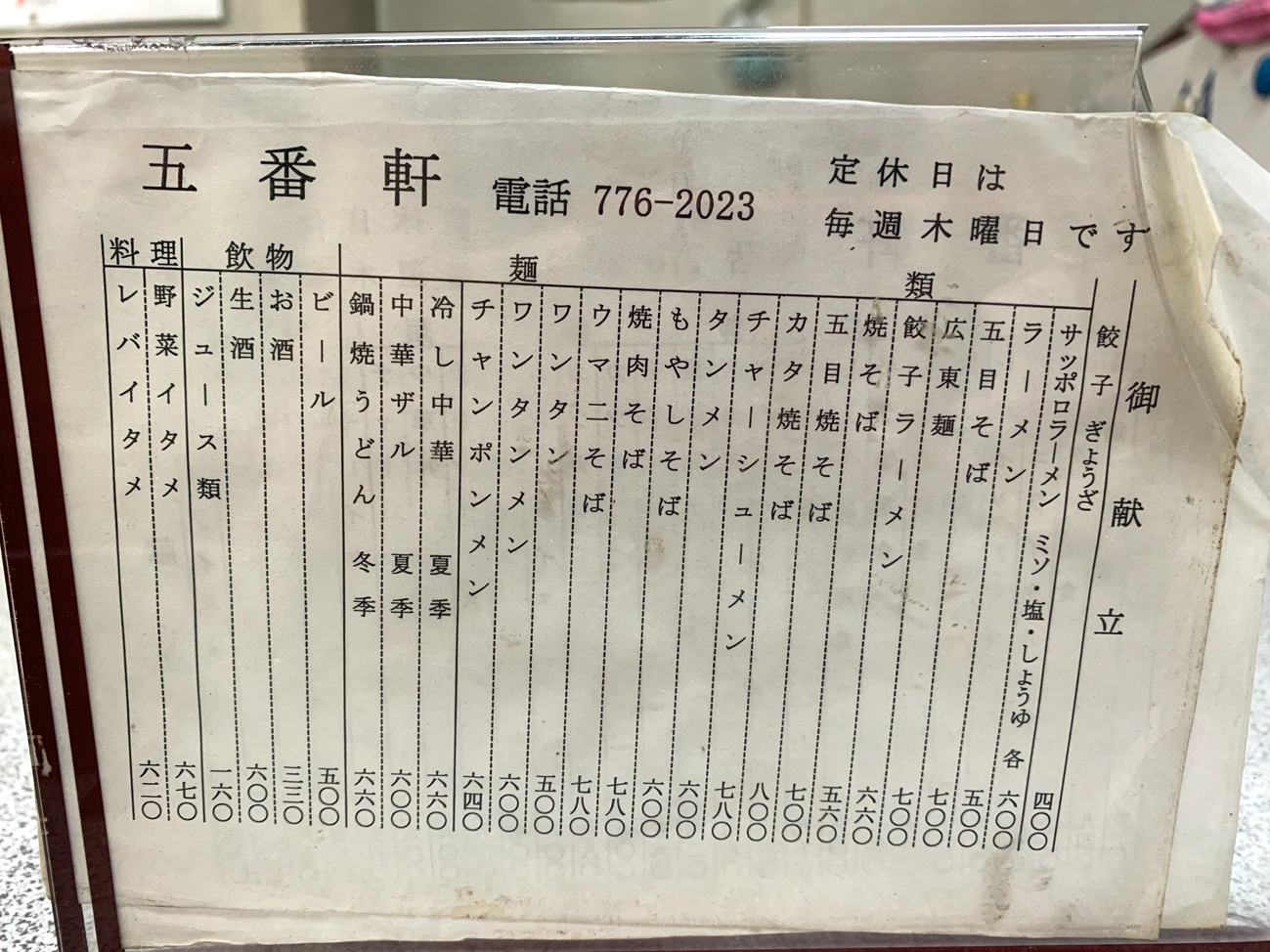 そうこうしているうちに、駅近の町中華「五番軒」へ。きっと過疎化が進む前は好立地で賑わってたんだろうなあ……。昭和哀愁漂う入り口から既に期待大! さぞ年季が入ったお味に違いない。ここで既にお腹が鳴り始める。