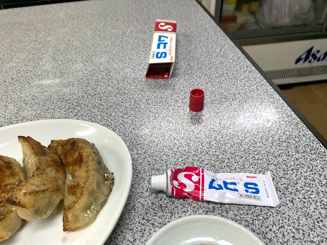 ムヒっ!! なんとお店のおばちゃんが僕の汗疹を心配してくれて、餃子と一緒にムヒを持ってきてくれた! 嘘でしょ、優しすぎる。ムヒってメニューにあったっけ⁇ 恋しい〜〜。青森のおばちゃん恋しい〜〜。ラブ〜〜。ムヒと餃子を運んでくれたそのシワシワのお手々に愛を感じるよ。人が優しいだけでこんなに生きやすい、愛は世界を救うんだ。ここで青森県産田子町ニンニクが効いた餃子とムヒの清涼感を手に入れる。
