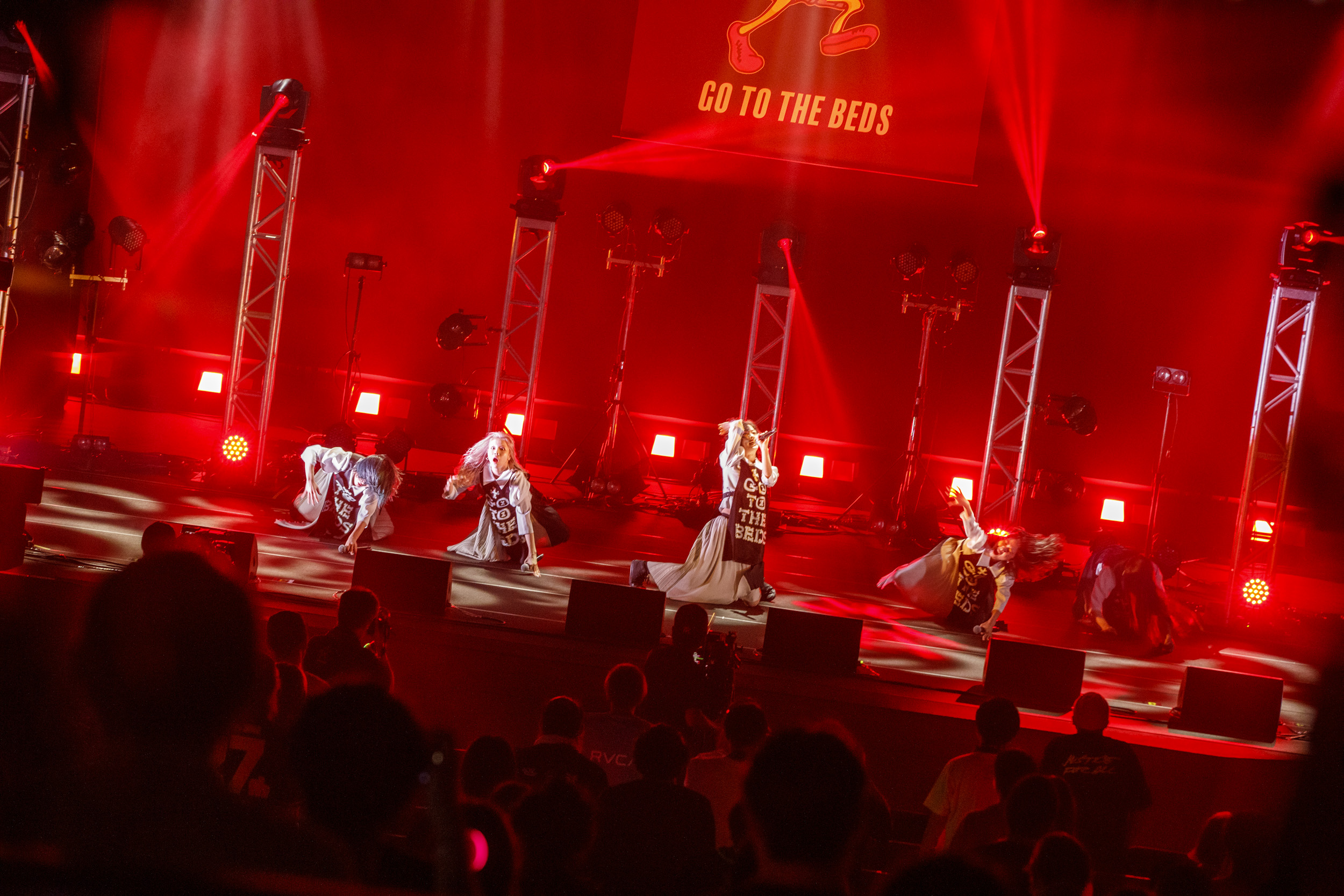 デビュー曲「Don’t go to the bed」を勢いよく歌い踊ると、アルバムから「GO TO THE BEDS is my life」、PARADISESメンバーのテラシマユウカ作詞曲「EGOIST」を続けて披露。ライヴハウスではなくホールでのステージ、なおかつSLEEPERたちが声を出せない条件下にいることで、いつも以上にメンバーのパフォーマンスに目がいく。前後左右、立体的にステージを使い、機動力あふれる緩急ある動きは、表現力豊かだ。
