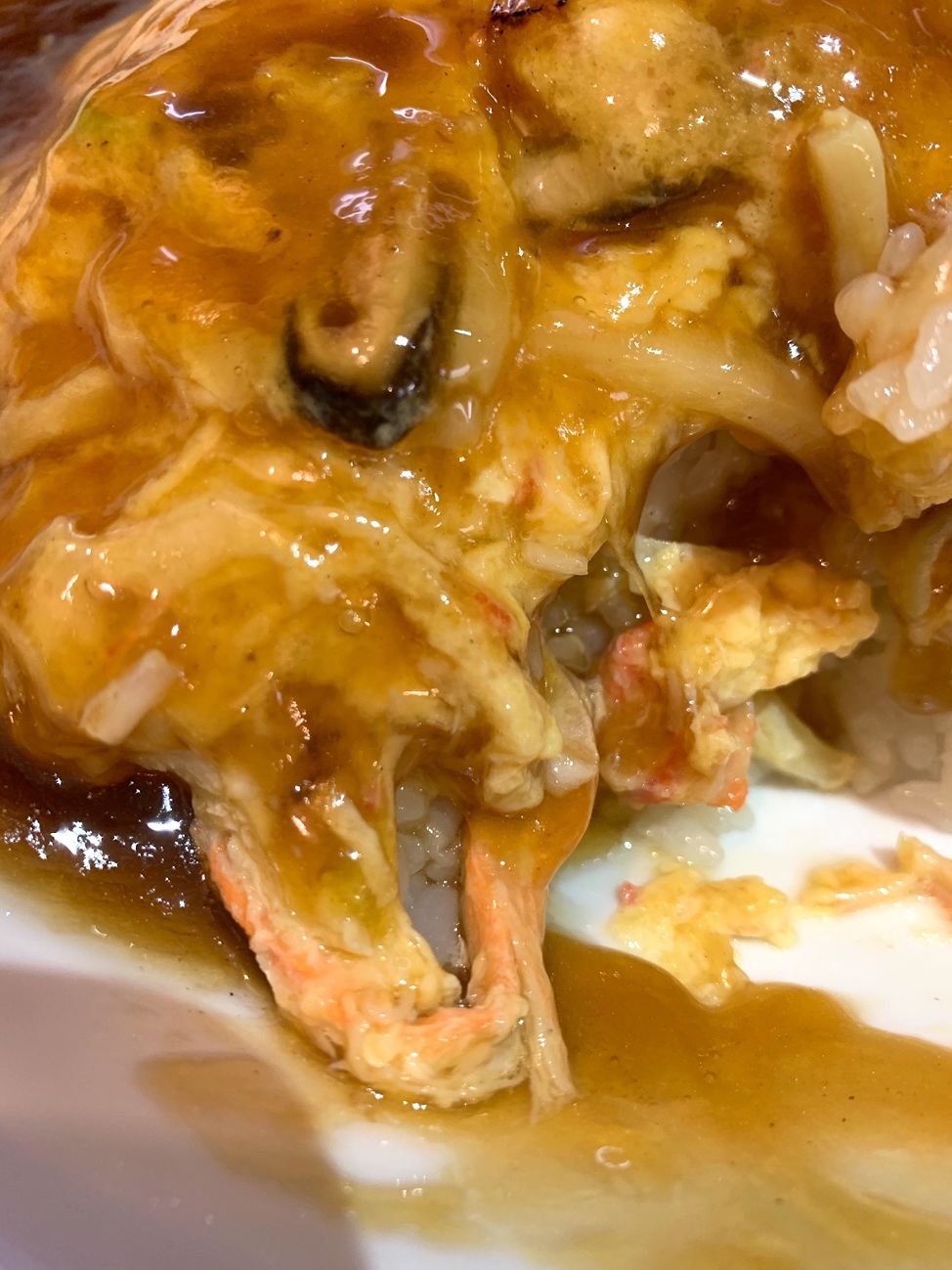 カニが!(カニカマかな?) やっぱり天津飯にはカニがなきゃね。お前は茶碗蒸しでいうところの銀杏なのであるよ。見つけて嬉しい、食べて嬉しい。お前が天津飯に光を照らしてくれているのだ。そして、先ほども触れたように程よい固さの白米もサイコー! 全てが箸を進めるために肩を組んで、シンクロ率400%! エヴァンゲリオンじゃない僕でも覚醒寸前や! ンマー!