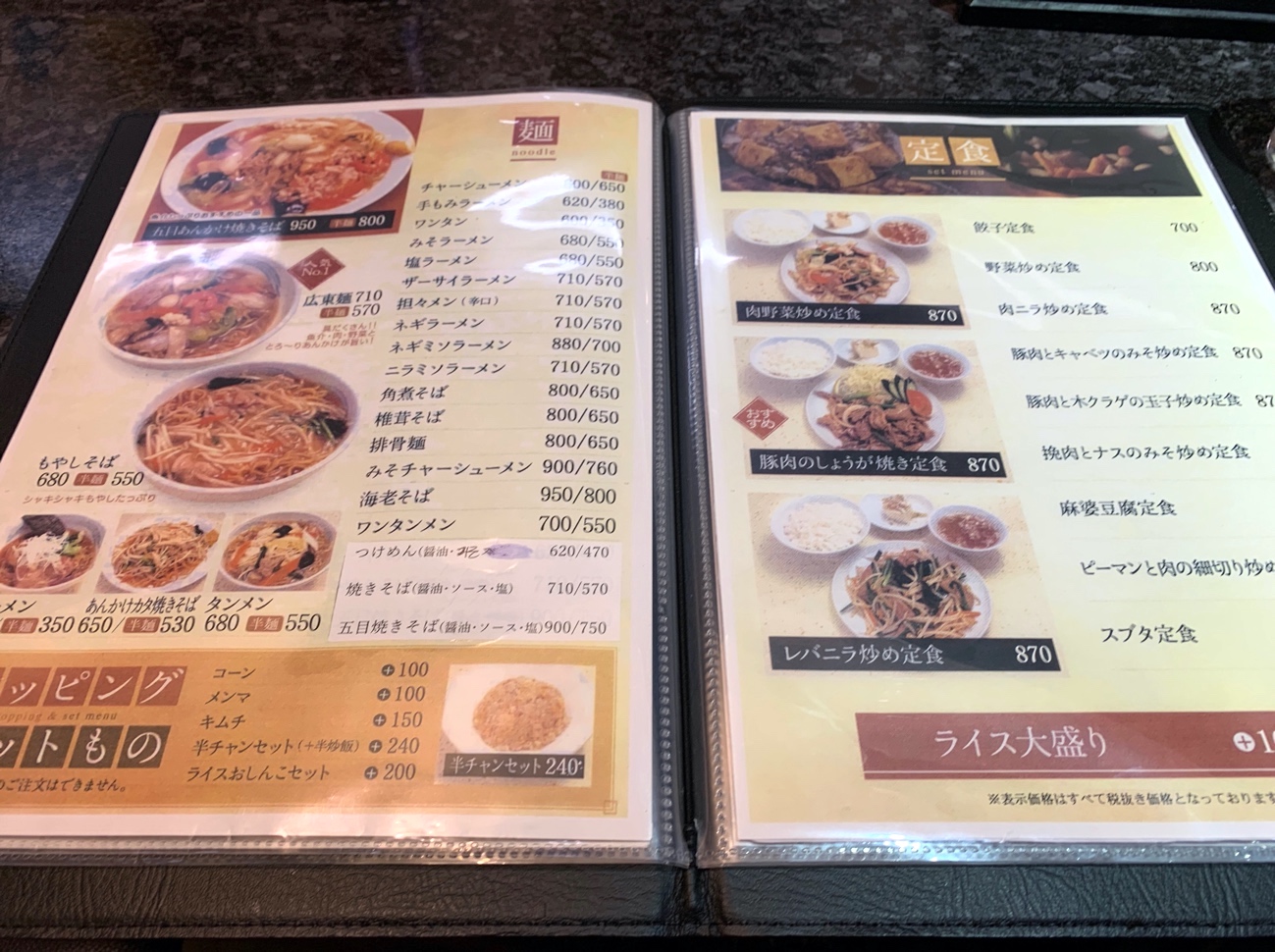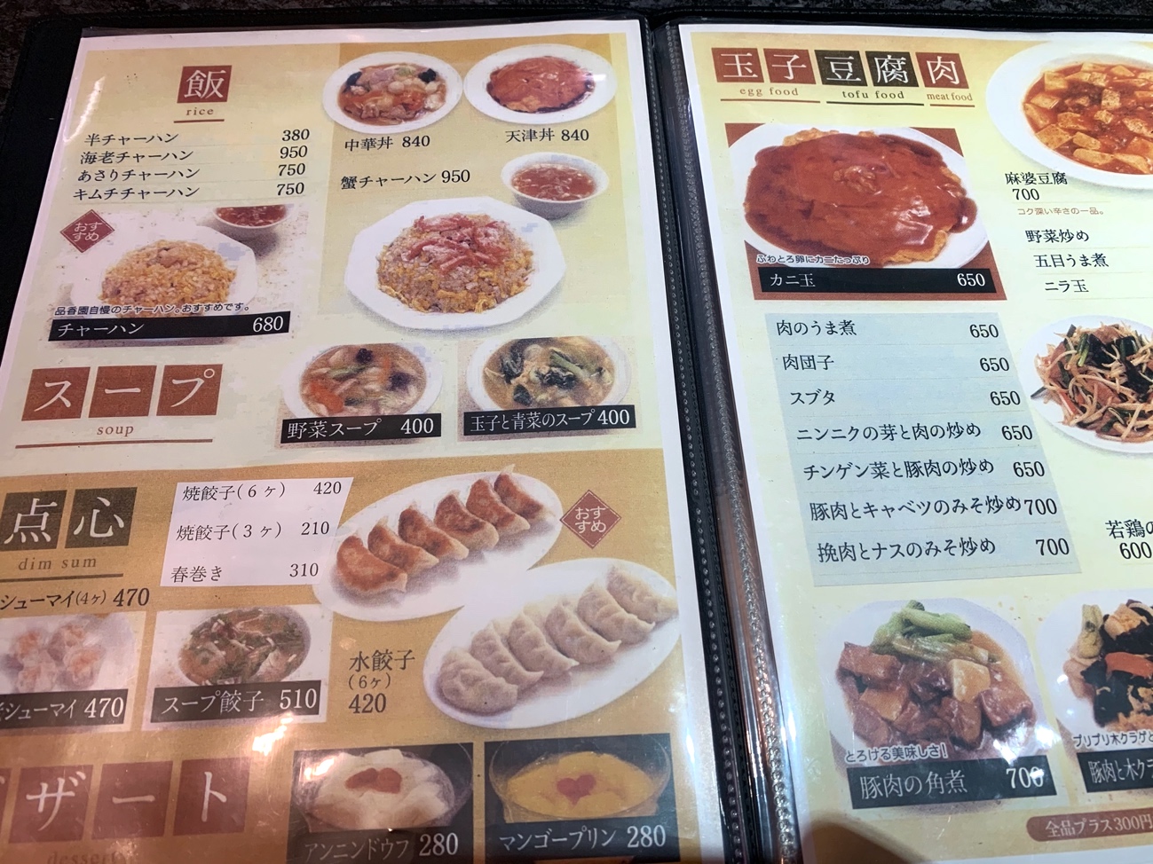こちらメニュー。排骨麵(パイコー麺)などある辺り、やはり街中華とは一線を画している様子。お値段もそこそこで、ランチにはうってつけ。早速、天津飯(840円)を注文させていただきます!