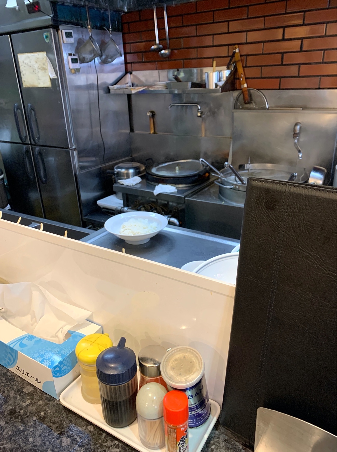 注文を済ませて2、3分ほどで目の前の丼に米が盛られる。カウンター席で食べると、こうやって臨場感も伝わってくるのが楽しい。お腹を空かせたまま、”あれは僕の注文かな?”なんて思いを馳せている時間も楽しい。○べログによると、ここの親父さんは中華料理一筋20年以上なのだとか。溶いた卵に具材を入れ、鍋に流し込んでお玉でしゅこしゅこ。火を通す時間は30秒もないだろうか、サッとご飯の入った丼に移して空いた中華鍋ですぐにあん作りへ。こちらも20年以上の経験を感じさせる手際でササッと仕上げて、同じく丼にin。