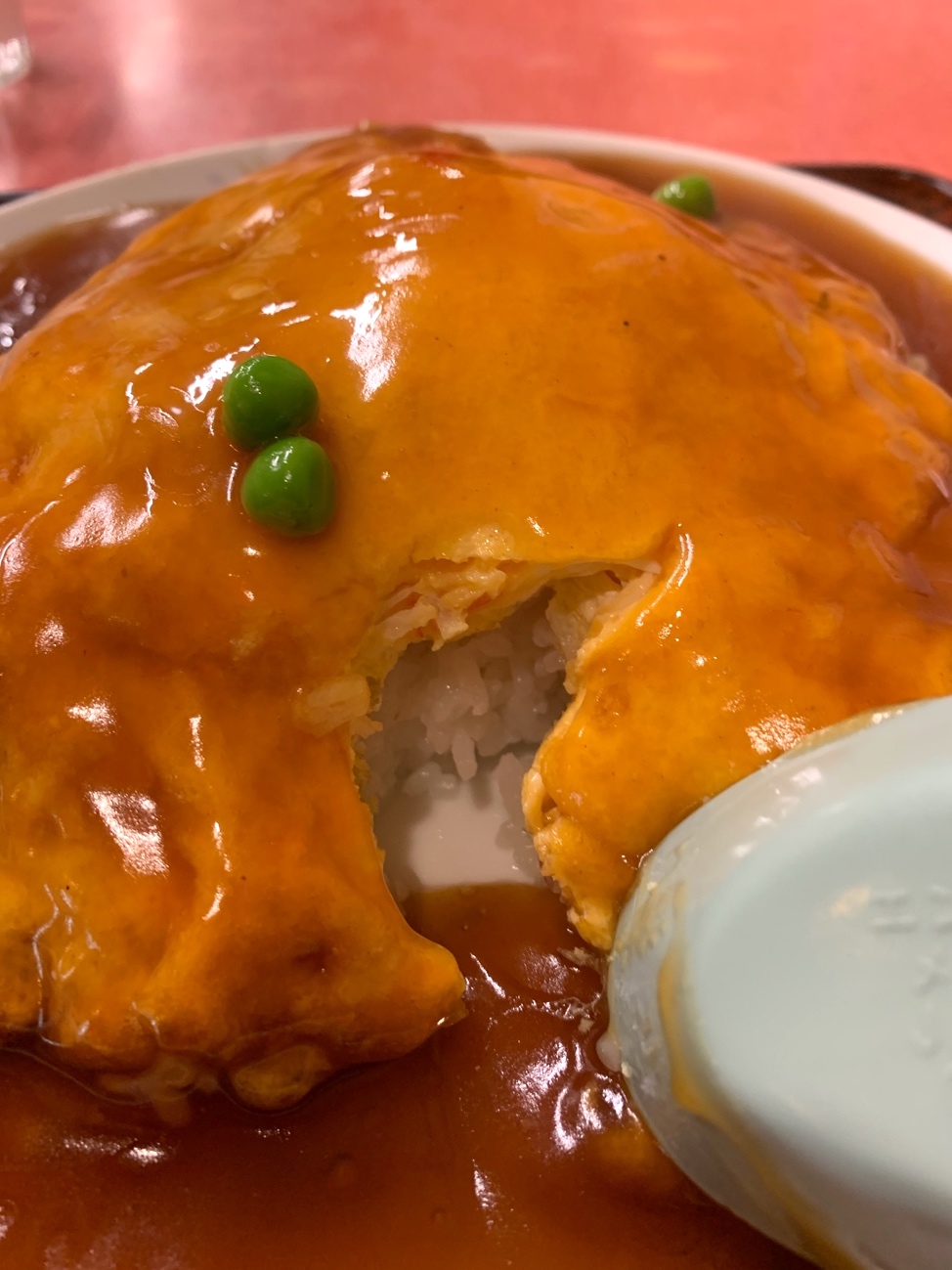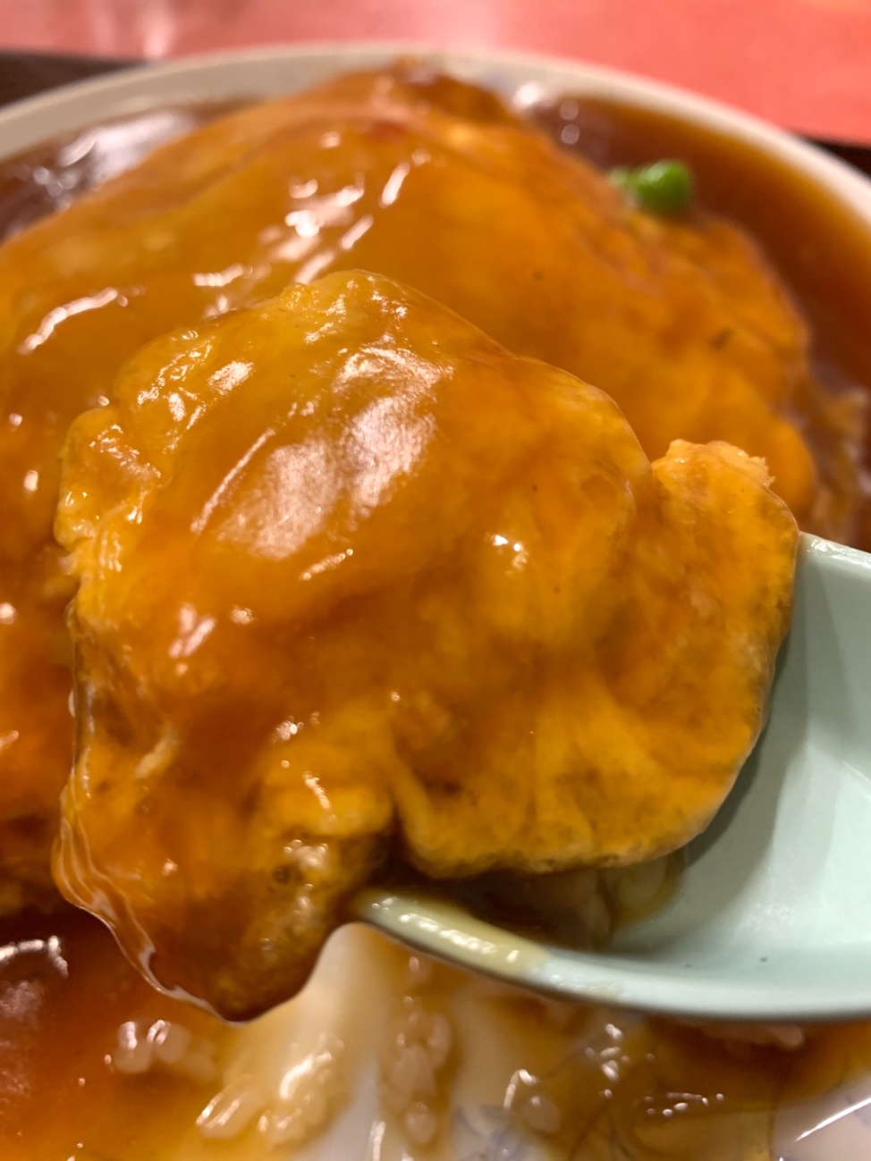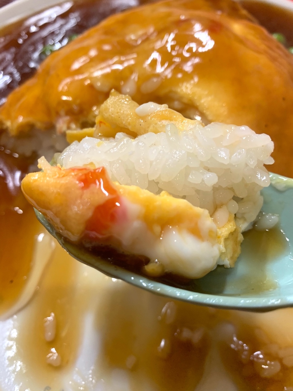 カニカマ? かな? 先述の濃いめの甘酢あんの中でも、ほんのり蟹らしき味がする。とはいえ、微かなアクセントになっていて、米をもう一口。うん、食指が進む! 筍とか椎茸など入っていない、あんで食べさせるオーソドックスな天津飯ではあるけど、これはこれで良いもの! うーん、止まらん!