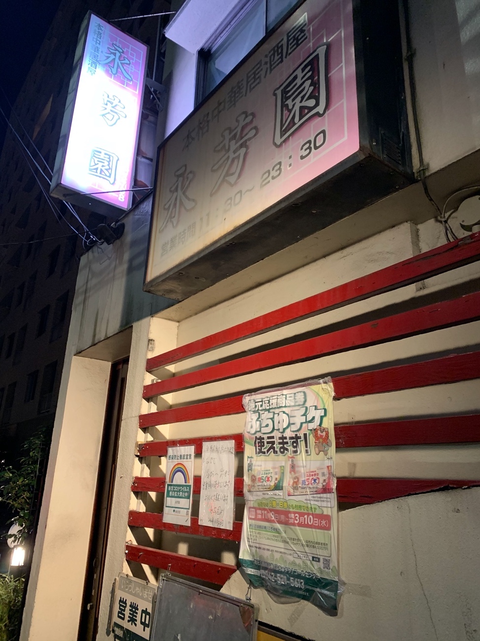 本格中華居酒屋「永芳園」。この府中という地で中国語を学び、友人と酒を飲み歩いた僕の青春の結晶のようなお店。ありがとう、本当にありがとう。懐かしさに涙を堪えながら、いそいそと入店するのだ。