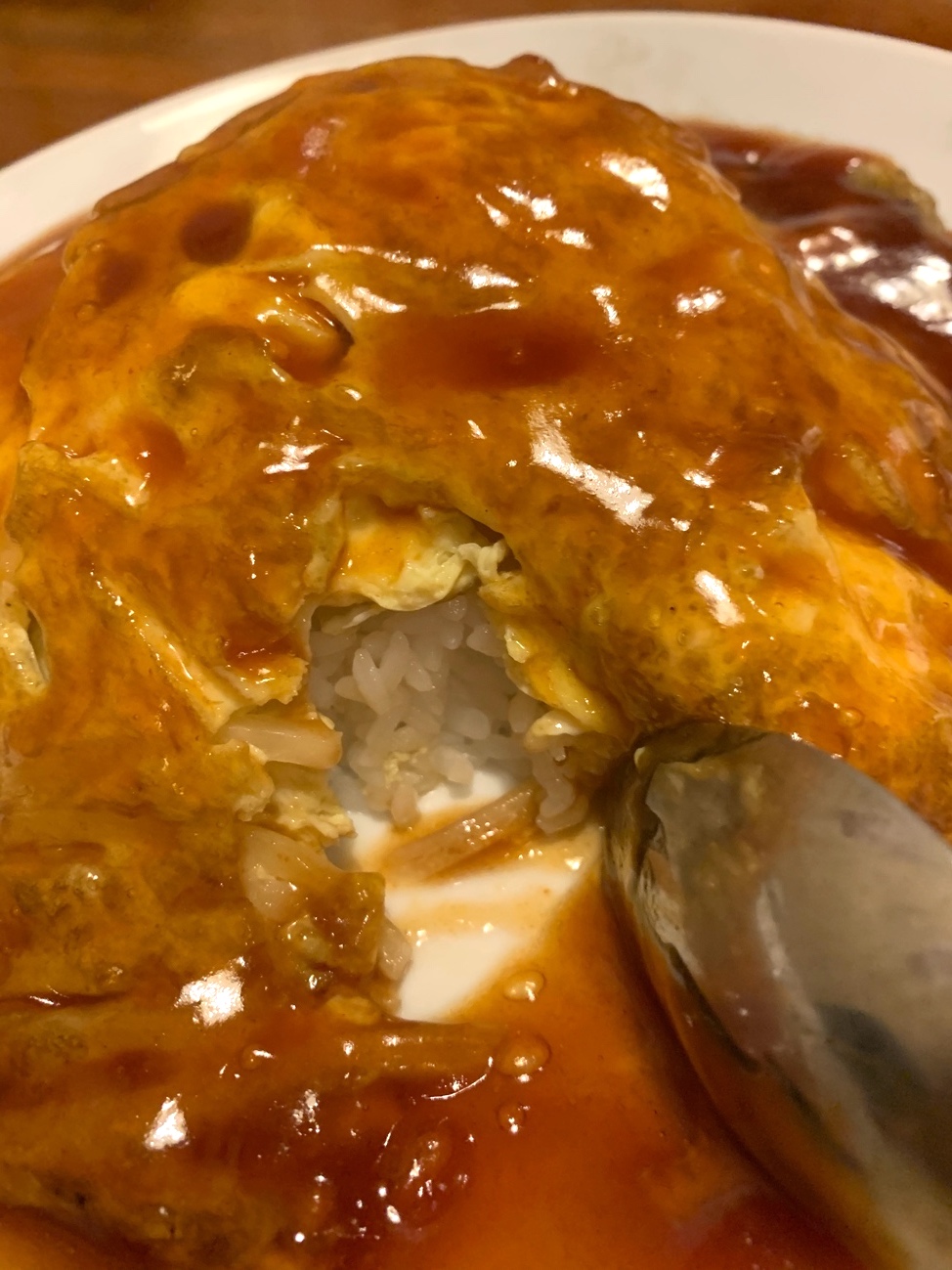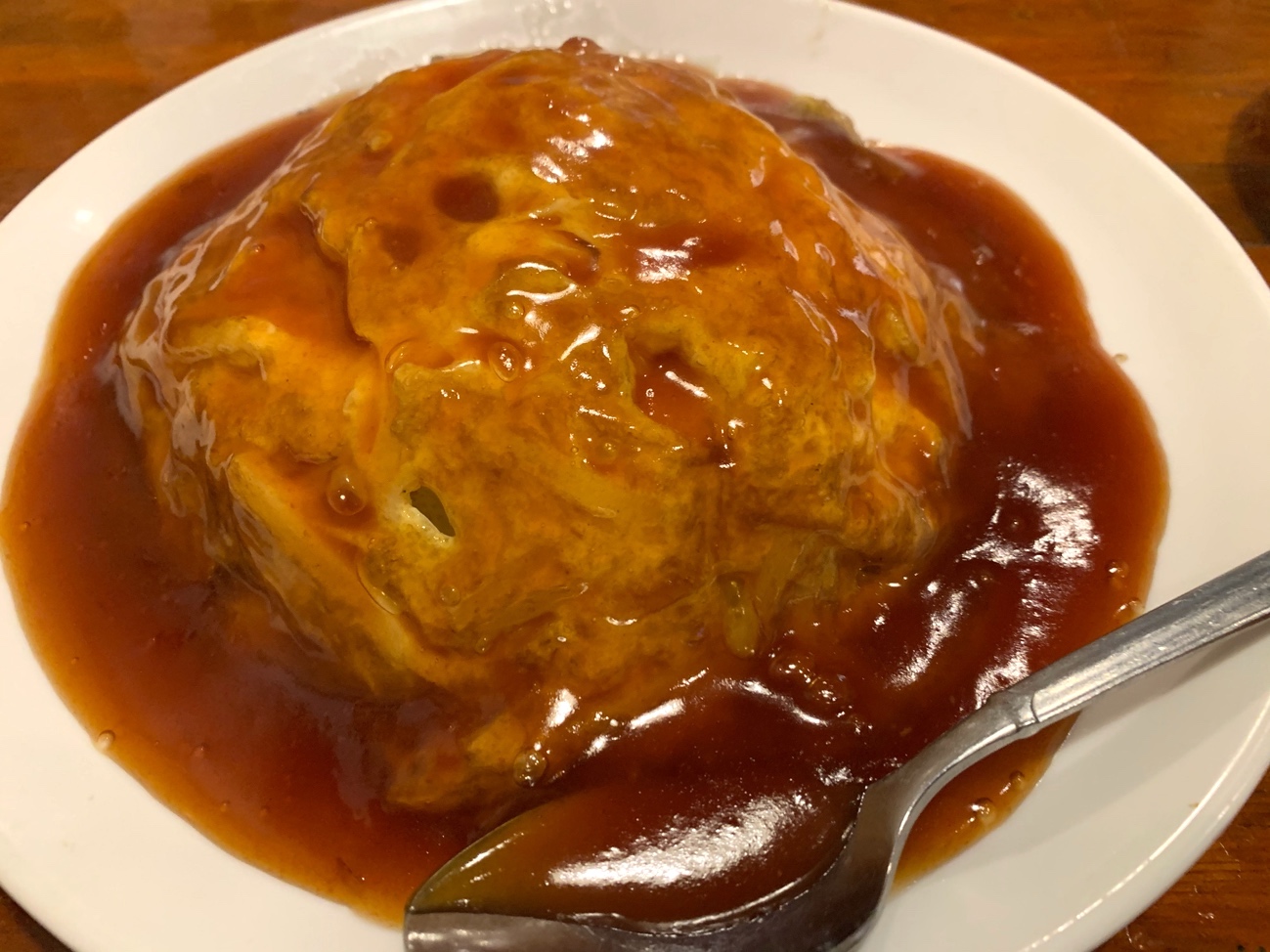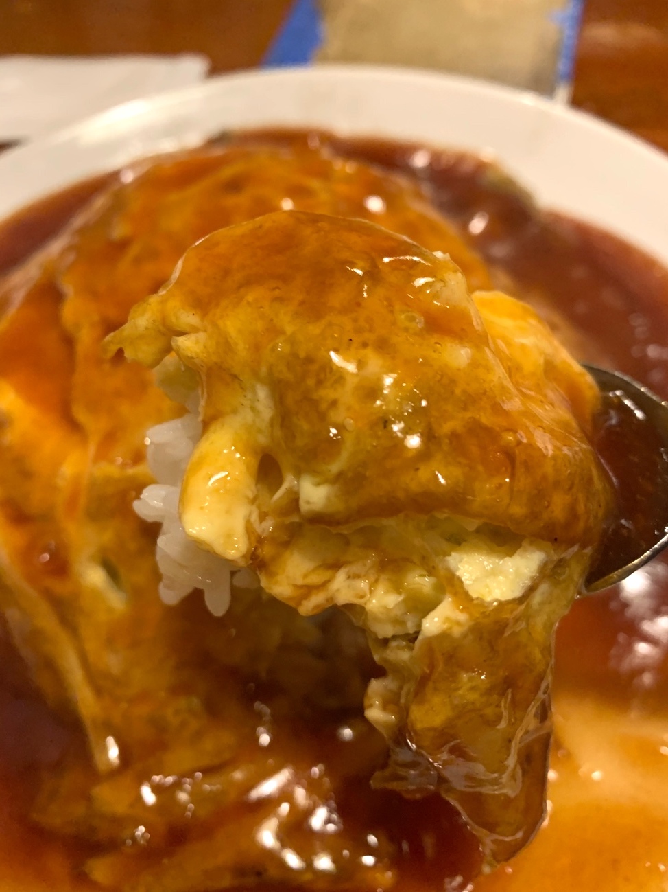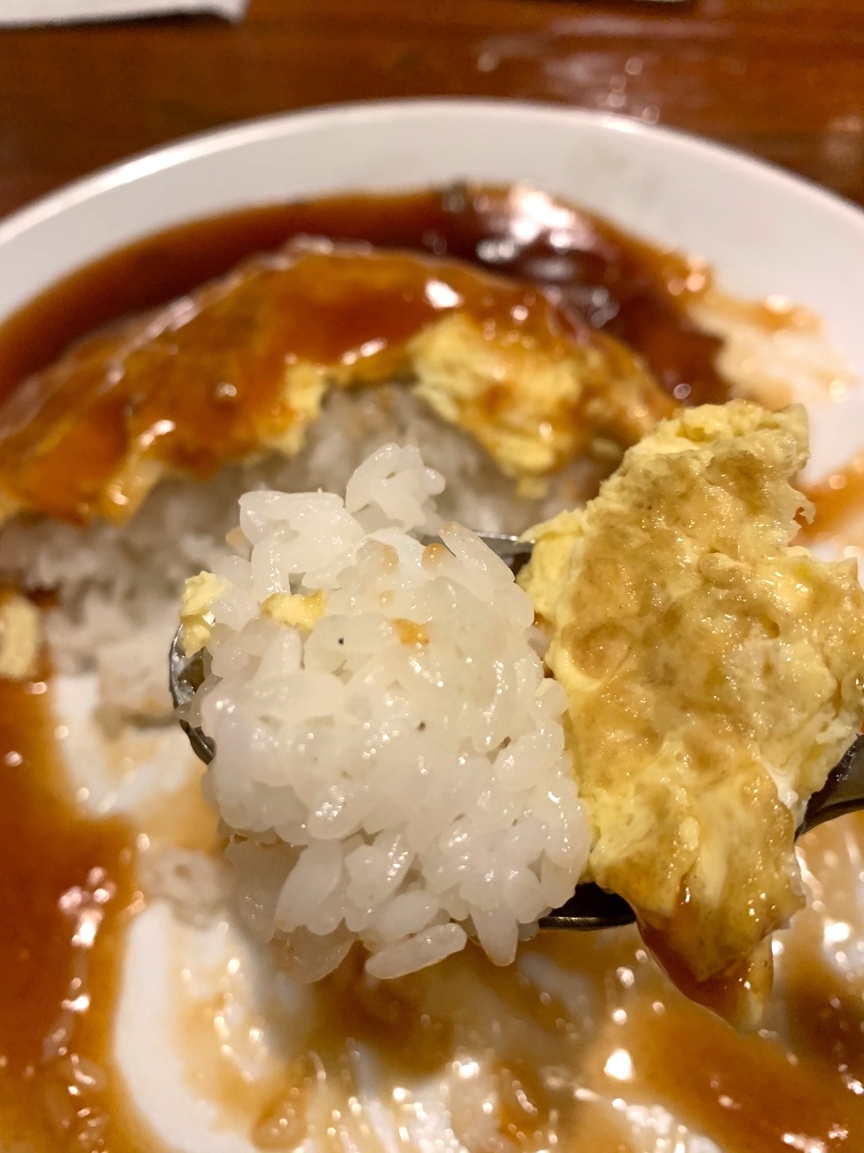 うーん、舌先にちょんっと酸味が残る甘だれ! 酸味がそこまで強くなく、口の中全体に柔らかい甘さが広がる。と思ったら、微かにごま油の香りもやんわり口内に広がって香ばしい、食欲がそそられる。んまい! 具材はなんと竹の子だけのオーソドックスの極みだけど、パリッと焼けた卵に程よいソースが絡まって程よい柔らかさになるのが素敵だ。そして、何より米がうまい。