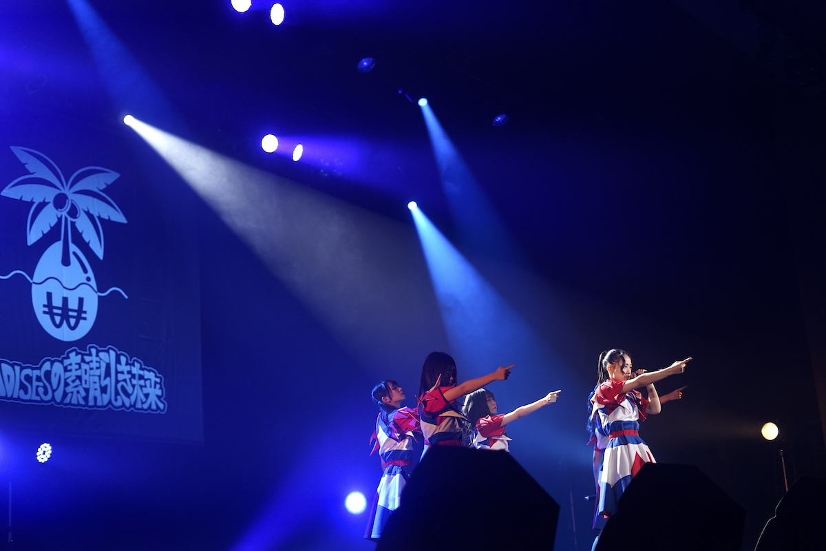 私は自分のことがどうしても好きになれない人間で、いっぱい辛いこととか悩んだりすると、自分を責めてしまうことがありました。でもアイドルになって、この世界に入ってから、PARADISESにも、PARADISESにいる自分にも、自信しか持っていなくて。どんなつらいことがあっても、全部PARADISESが忘れさせてくれる気がして、本当にこの場所に立てて私はライヴをするたびに幸せだと思います。今日はみなさんに私たちの最高の楽園を届けにきました。どんな未来が待っていようとしても、この大好きな音楽たちと大好きなPARADISESを、大好きなみんなにもっともっと知ってもらえる、好きになってもらえる、そんな素晴らしい未来を私たちは絶対に叶えてみせます。私たちはいつでもみなさんのことを楽園で待っています。最後は頭も心も空っぽにして一緒に楽しんでいきましょう!」