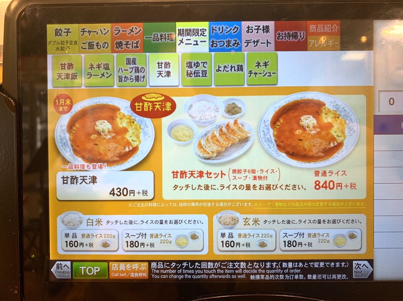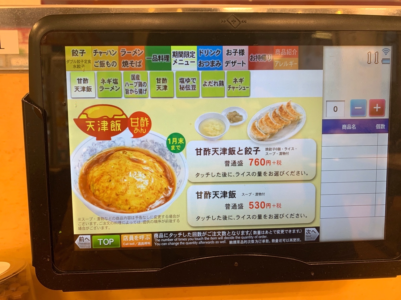 早速座席に立て掛けられたタブレット端末で注文をば。なんということだろう、僕の目に飛び込んできたのは、前回と変わらぬメニュー写真の「甘酢天津飯」だったのである。