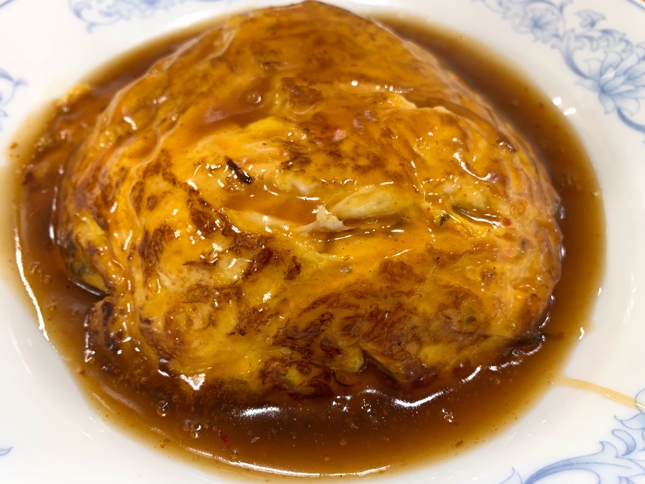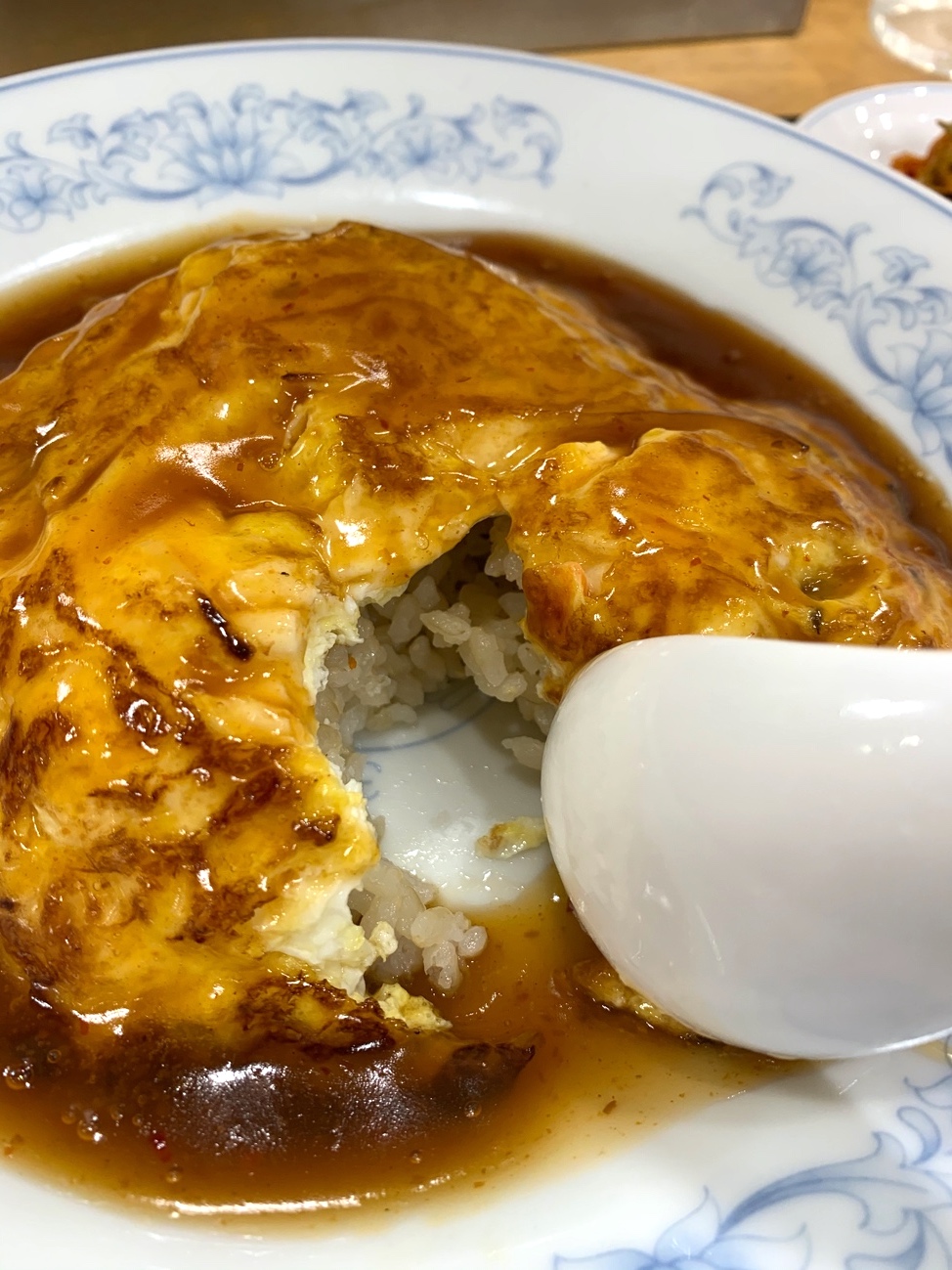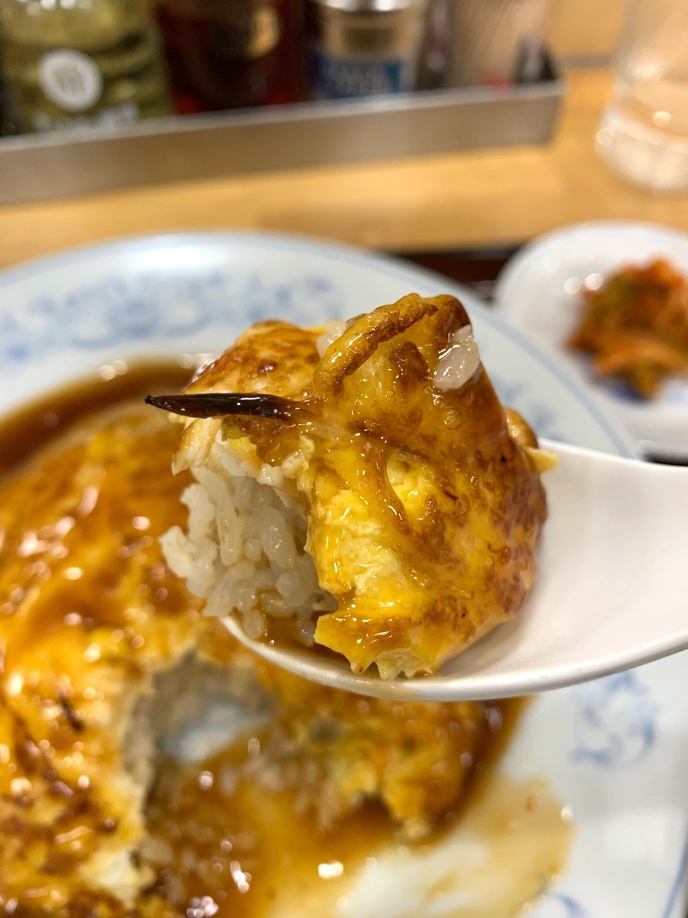 具材では、にんじん、玉ねぎ、たけのこ、しいたけ、そして前回意表を突かれた豚肉もあったが、今回は前回なかった(はず)のキクラゲが目立った! コリっとした食感は唯一無二の存在感。彼らが芙蓉蟹、もとい! 天津の具材オールスターズ! 30円値上がりしたものの、500円台の天津飯としては相変わらず驚きのコストパフォーマンス。飯を食わせるタイプの具沢山天津飯である。付け合わせは、ザーサイからキムチに変更されていた。しかし、キムチの食感や辛さも同時に食べることで、箸休めどころか味変も可能。東アジアの理想が530円で、この器の中に体現されている! んまい!