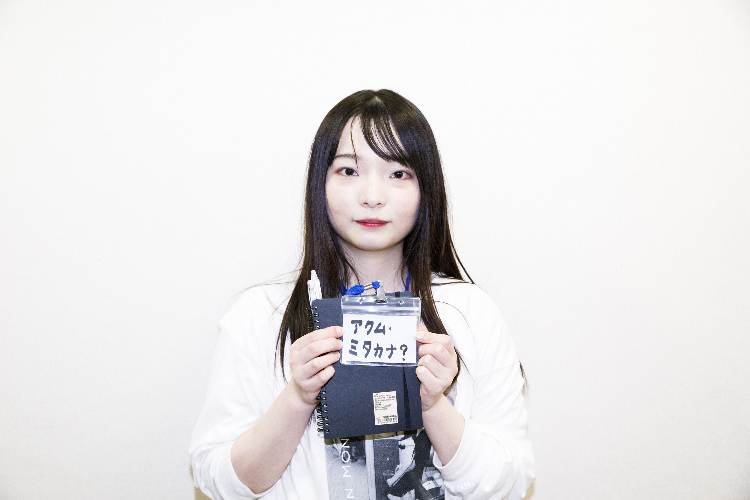 アクム・ミタカナ?:質問に答えたり、それに対して質問することはできるけど、自分のことを話すのは苦手で。カメラの前で1人になったとき独り言みたいなのができないからダメだなと思ったんですけど、がんばりたいなと思います。歌唱審査はうまくできなかったから、それを次で挽回するというのを伝えられてよかったと思っています。WACKのアイドルになるために来たので、帰りたくないし、最後まで残ってWACKのアイドルになります。