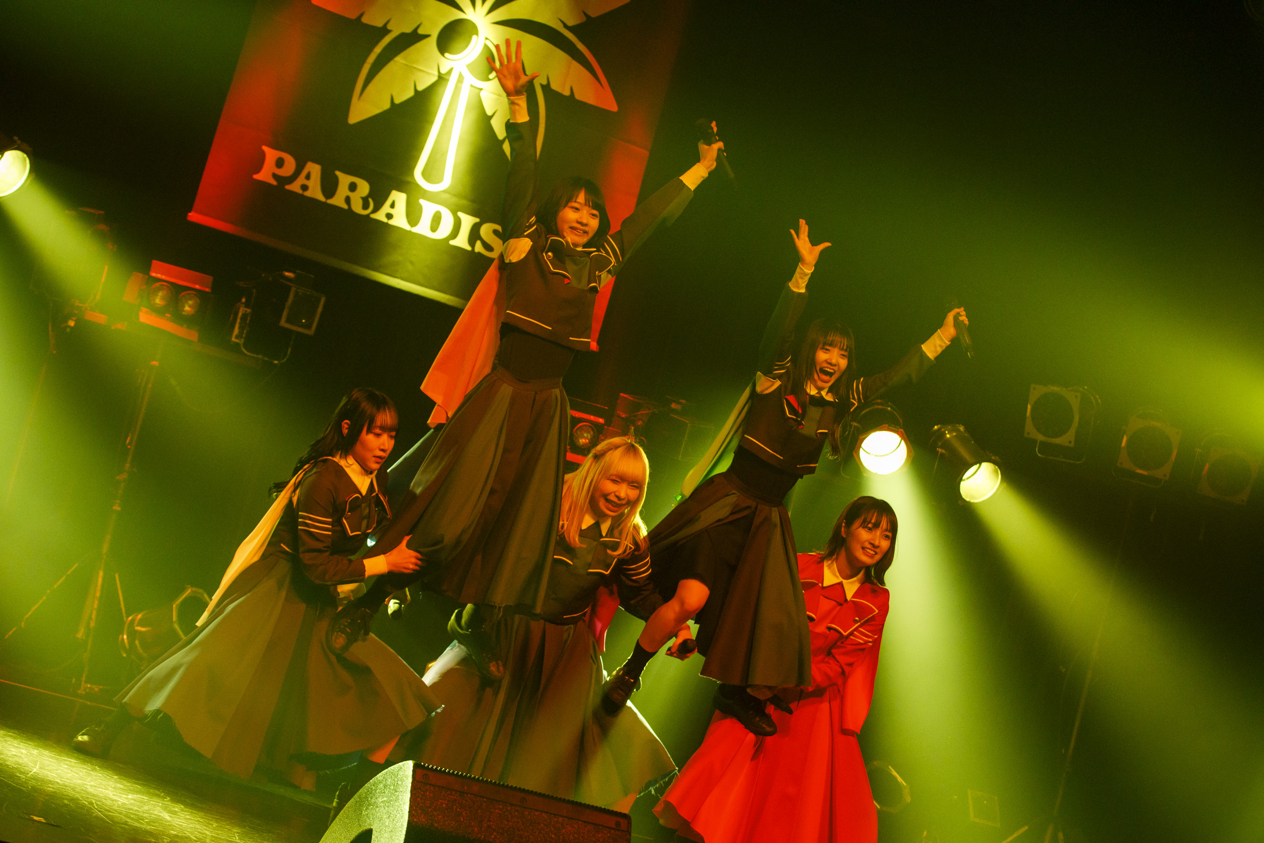 再び設けられたMCのコーナーでは、「正統派美少女が加わりました」と改めてキャ・ノンの加入を紹介。そして、PARADISESはTikTokやインスタグラムなどをやっていることもあり若い層に見てもらえているが、どうしたら豆柴の大群のようにキッズ層に人気が出るかを議論。いままでライヴ内で行ってきたコントが金玉やパンストなど下品だったから、子供向けに戦隊モノをやってみてはどうかという意見から、戦隊モノのコントをやることに。