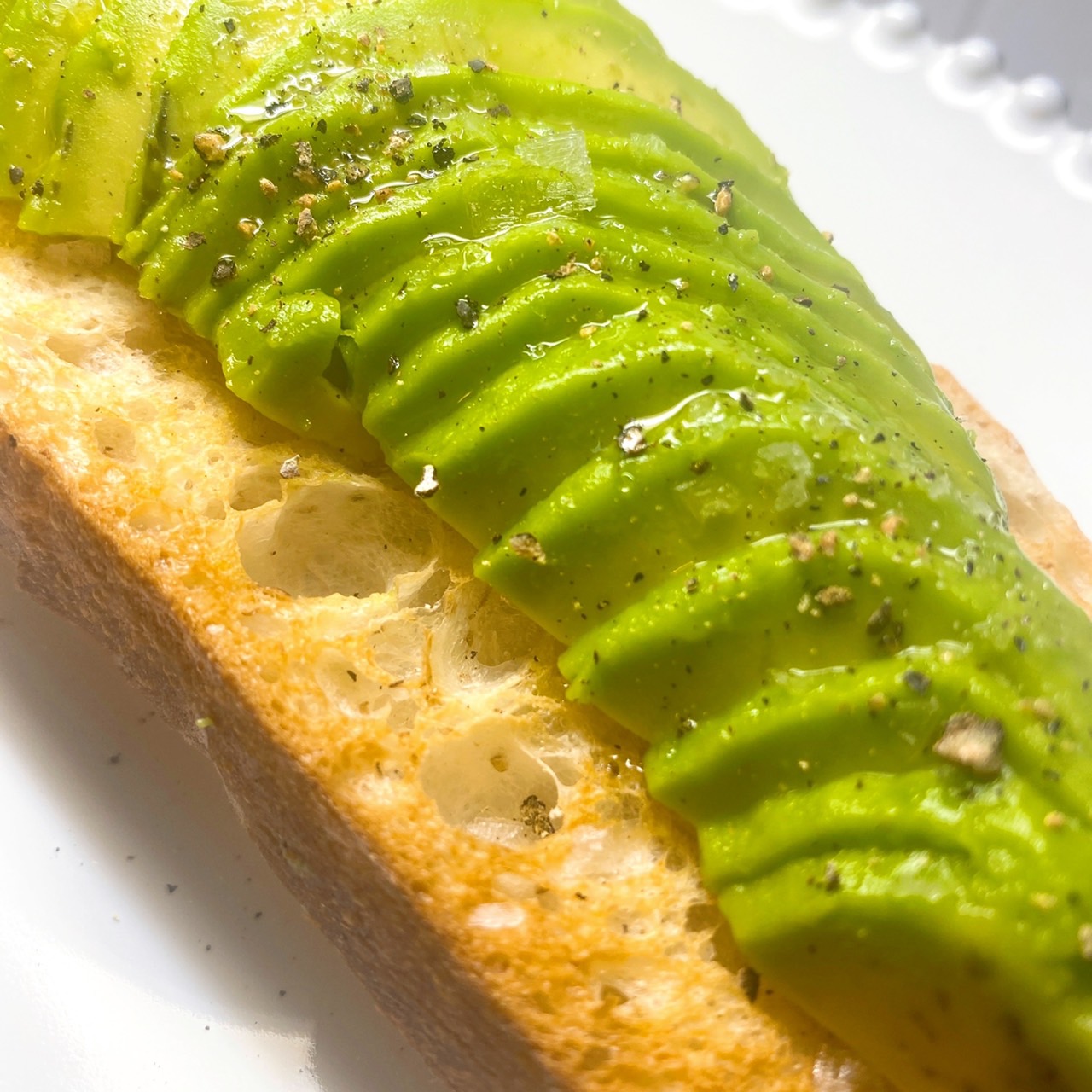 パンはカリッと焼き、なるべく薄ーーーーーーーーく切ったアボカドをのせ、オリーブオイルと気持ち多めの塩こしょう。