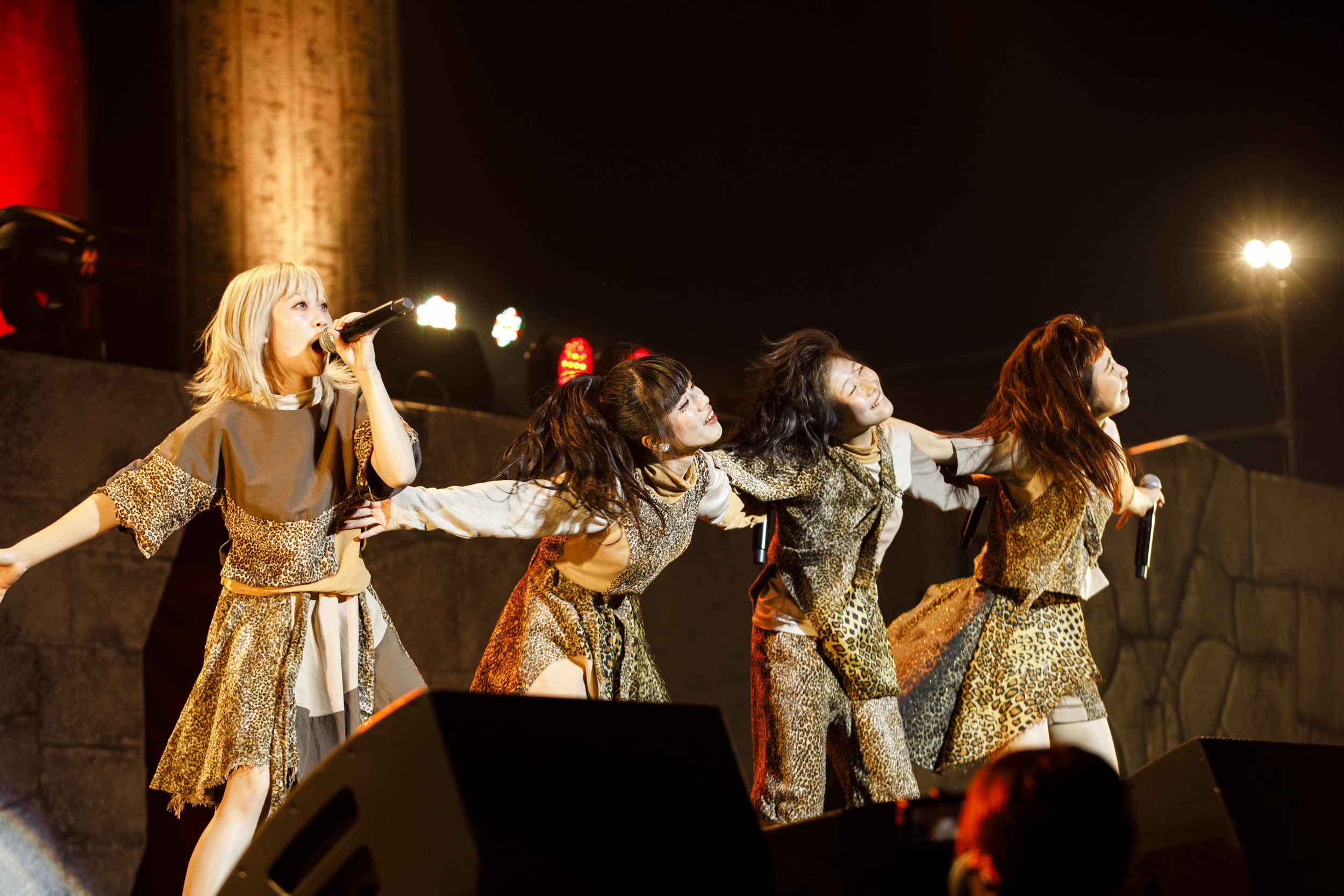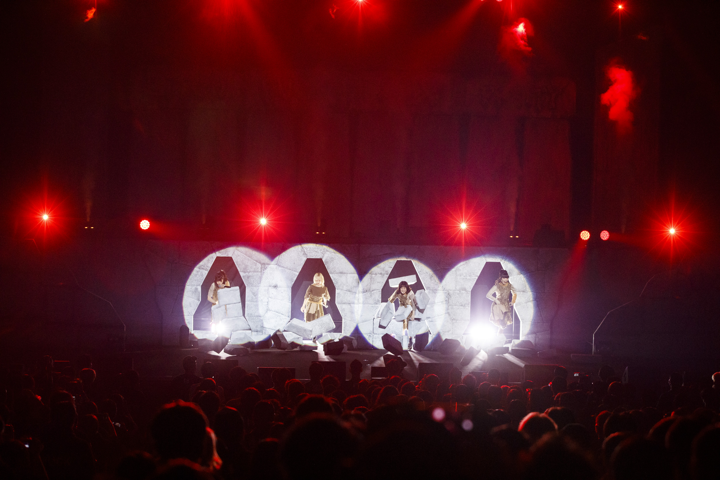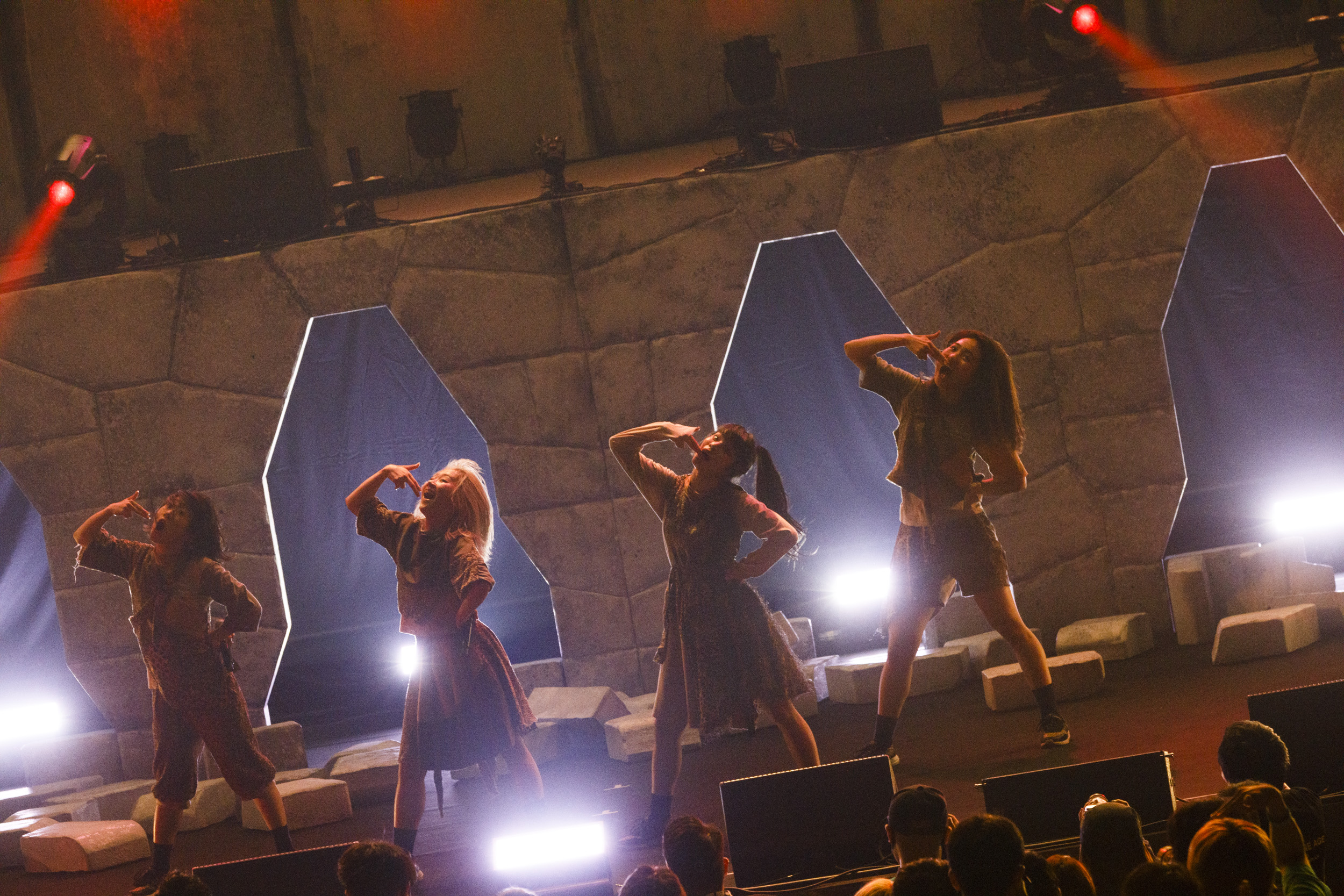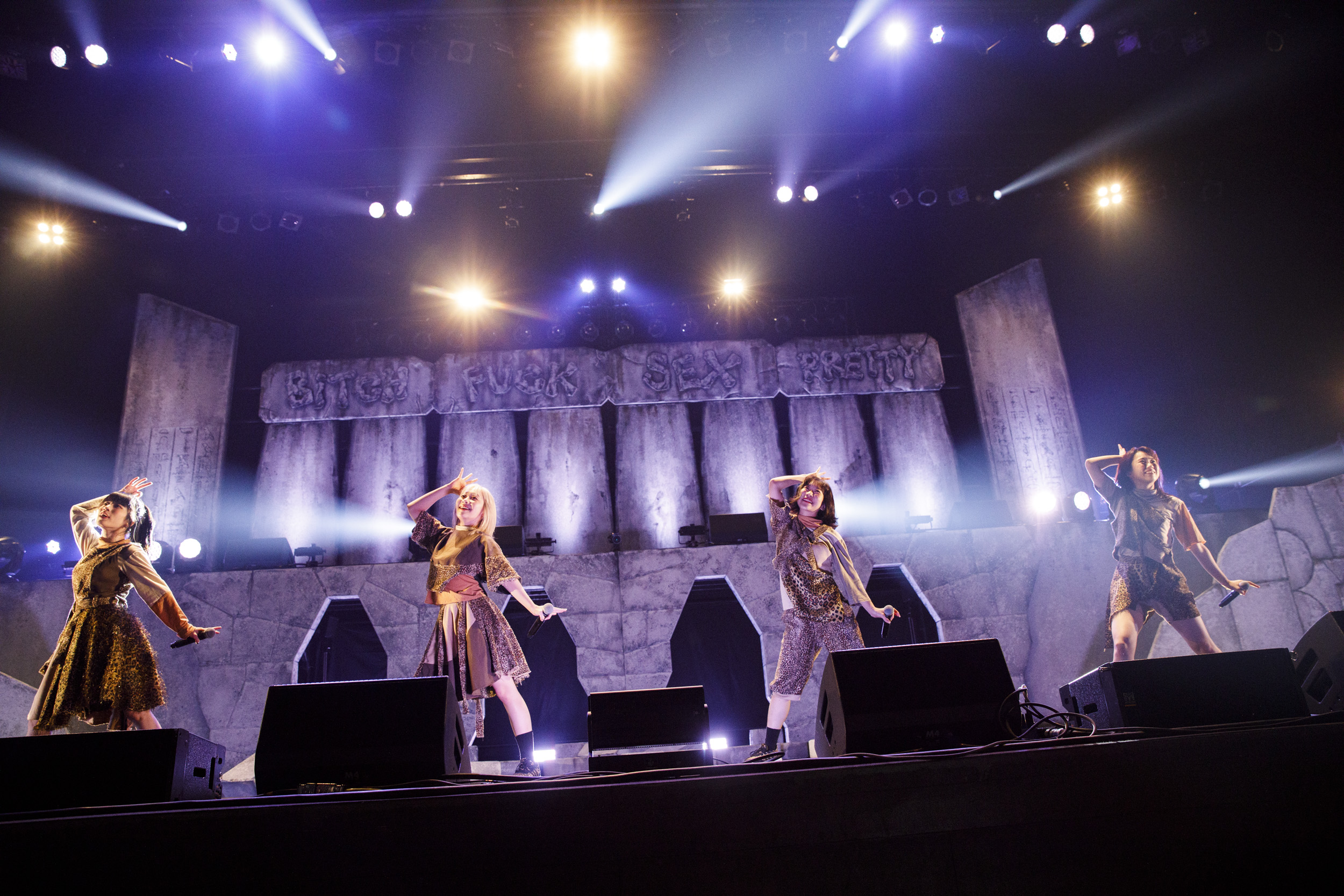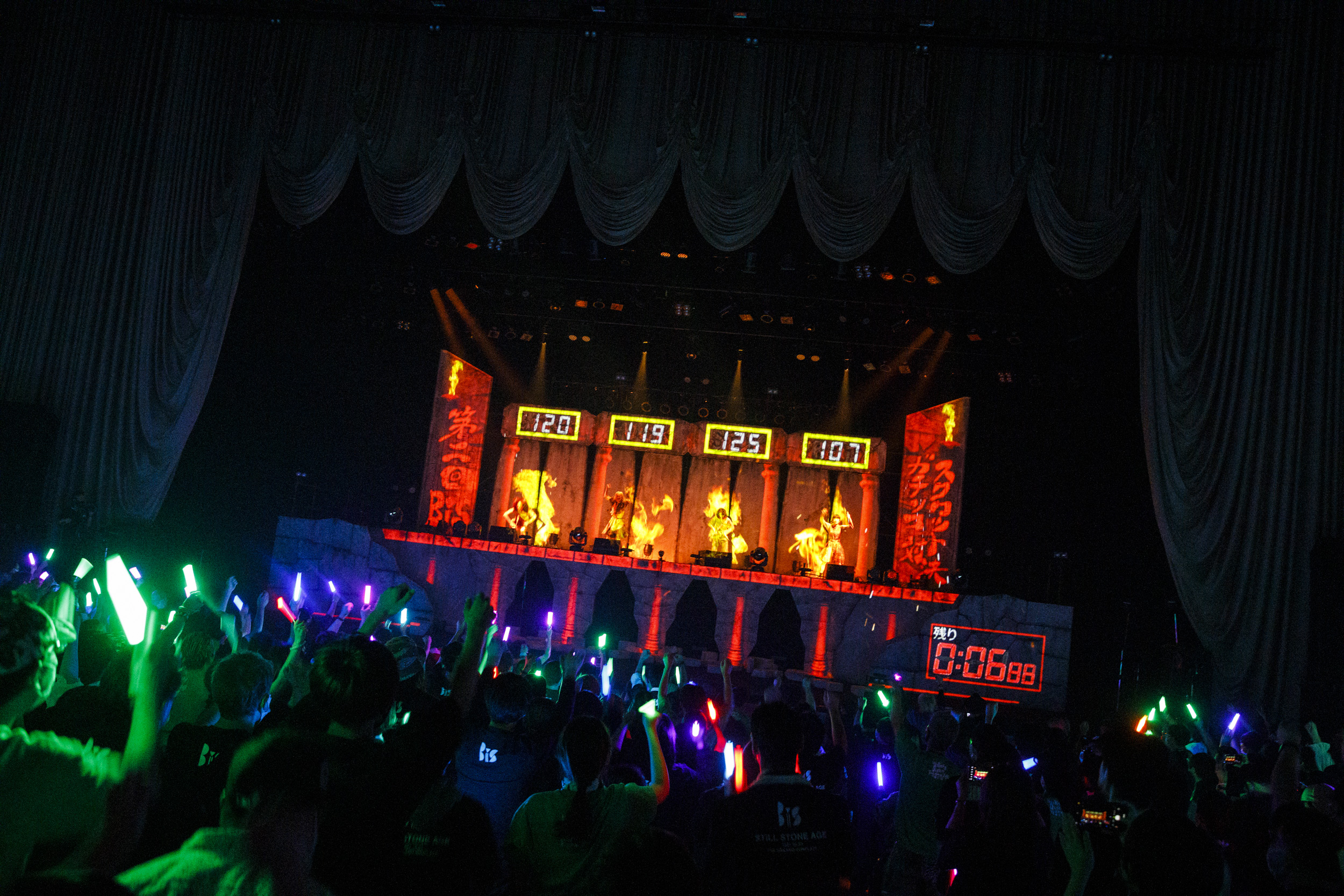 18時10分。会場が暗転すると、ステージ上のセットにAD2021年からDC30000までカウントダウンの文字が表示されていく。DC30000になり、火山を背景に「BiS STiLL STONE AGE」のタイトルが表示されると、マンモスを追いかけるネアンデルタール人や、焚き火を中心に祝祭をしているようなイラストの映像が流れ、ステージ上部に掲げられた「BiTCH」「FUCK」「SEX」「PRETTY」の文字が炎色に燃え上がった。すると、メンバー4人――トギー、ネオ・トゥリーズ、イトー・ムセンシティ部、チャントモンキーが舞台の岩を突き破って登場。研究員たちの大きな拍手の中、「LET’S GO どうも」でライヴがスタートした。続けてBiS始まりの楽曲「STUPiD」、ハードでメロディアスな「FOR ME」と、研究員たちも一緒に振りを真似しながら3曲を一気に駆け抜けた。