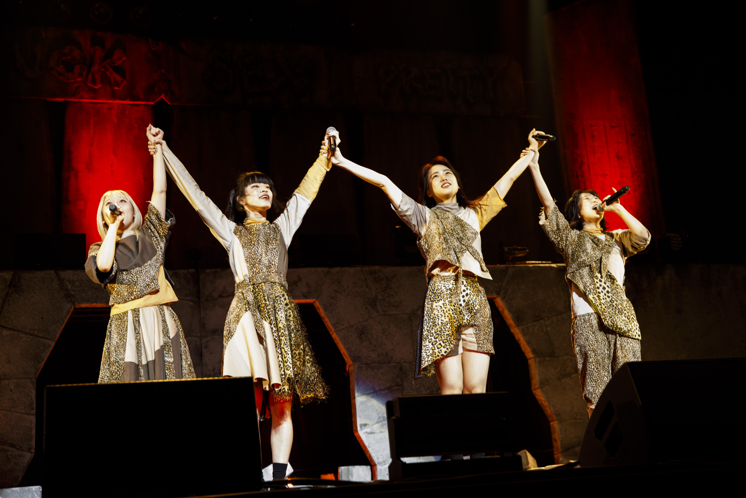 「はじめまして、私たち新生アイドル研究会、BiSです!」と挨拶し、1人1人自己紹介すると、「よろしくおねがいします!」と4人は深くお辞儀をした。ギターバッキングの上で走るピアノがエモーショナルな「HiDE iN SEW」、ネオ・トゥリーズの声の伸びが映える「I ain’t weak maybe..」、ファンキーなギターとうねるベースが特徴的な「DESTROY」を披露すると、一転して静と動の緩急で爆発を見せる「COLD CAKE」で研究員を魅了。メロディックパンク曲「BASKET BOX」で研究員たちも両手を交互に振り上げ一体感を生み出した。
