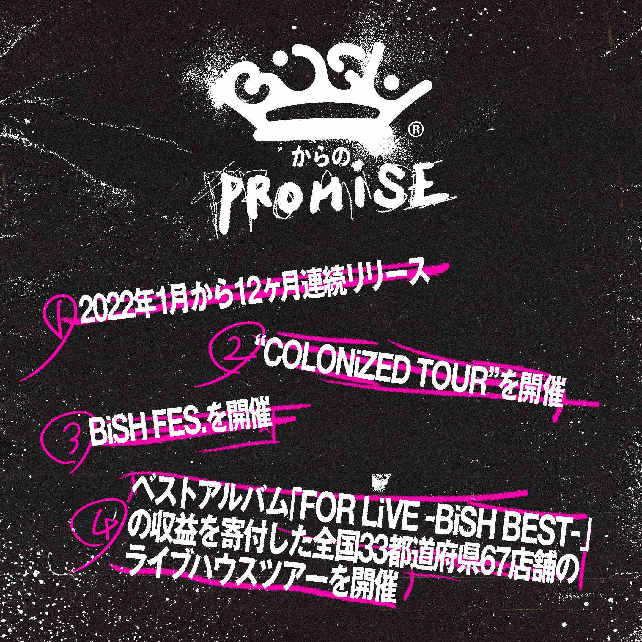 内容は、2022年1月から12ヶ月間、毎月パッケージをリリースすること、今までライヴを開催したことのない地域でのホールツアー“COLONiZED TOUR”の実施、BiSH FES.の開催、2020年7月に発売したベストアルバム「FOR LiVE -BiSH BEST-」の収益を寄付した全国33都道府県67店舗のライヴハウスツアーの開催となっている。