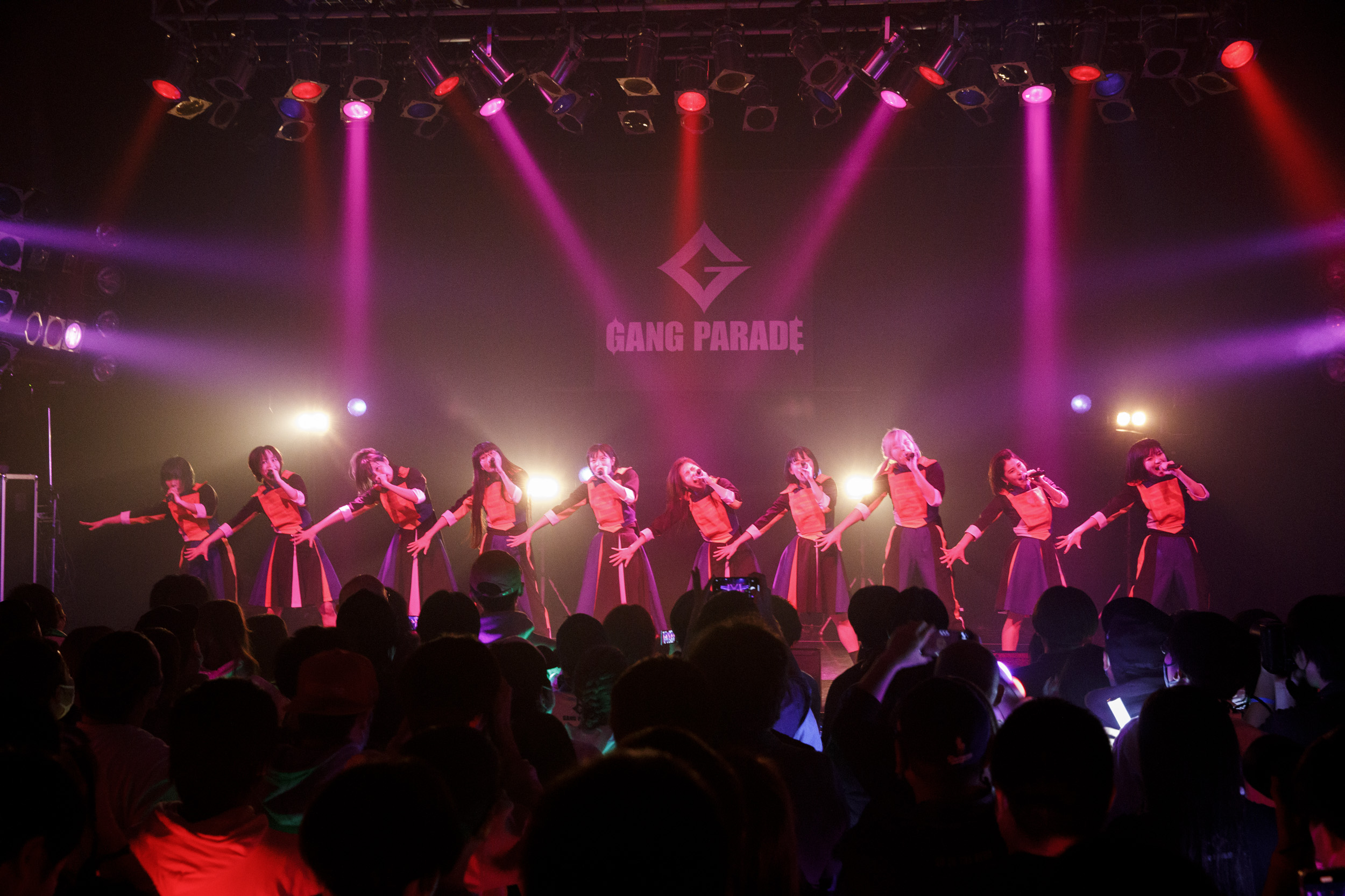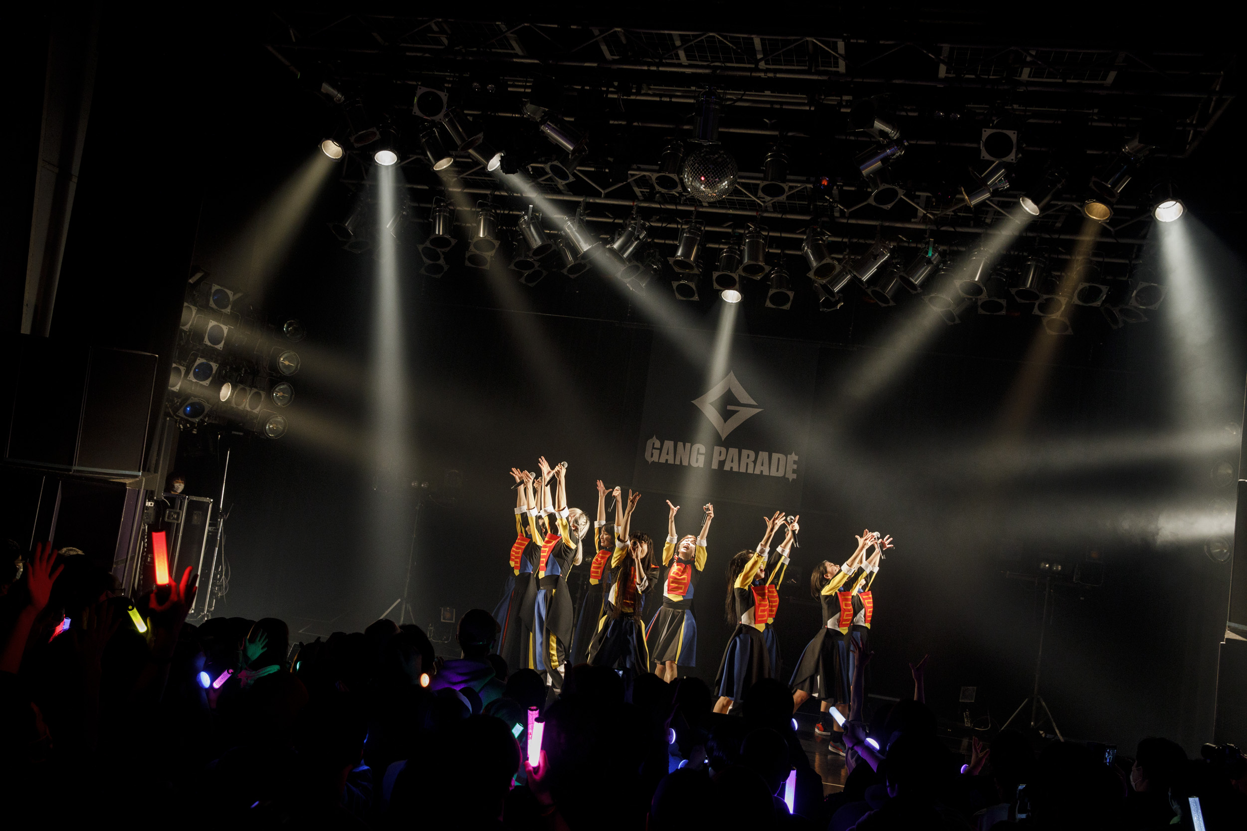 三連発を披露し終え10人が横並びになると、ヤママチがきっかけとなり「あらためまして! 私たちエンジョイプレイ、みんなの遊び場、GANG PARADEです。よろしくおねがいします!」と挨拶。止まない拍手の中で1人ずつ自己紹介をし、「再始動したGANG PARADE、よろしくおねがいします」と挨拶をすると、10人が横一列となり正座のポジションに。遊び人たちからどよめきが起こる中、ヤママチが「現状間違いなくGO TO THE BEDS」をタイトルコールすると、遊び人たちから大きな拍手がわき起こった。GO TO THE BEDがどん底時に生まれた楽曲を10人の迫力でパフォーマンスすると、この日一番の拍手に会場は包まれた。
